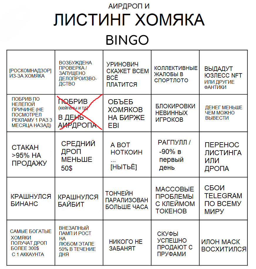 Думаю не я один запас попкорн, поэтом предлагаю запилить двачебинго, чтобы наблюдать за суетой было интереснее. Предлагайте свои пункты, какие события/сюжетные повороты мы ждём от хомяка
