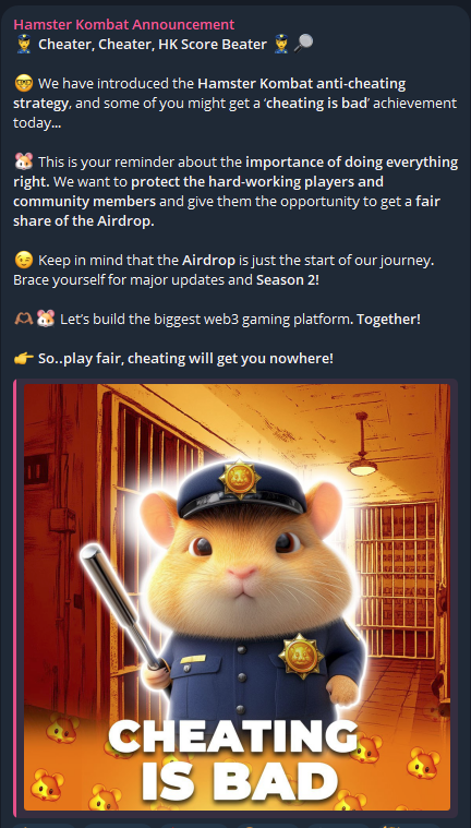 🐹 Это ваше напоминание о том, как важно все делать правильно. Мы хотим защитить трудолюбивых игроков и членов сообщества и дать им возможность получить справедливую долю Airdrop.