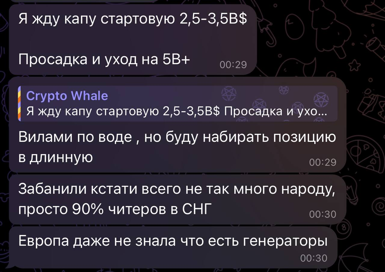 В общем, как выяснилось, Crypto Whale - это сын человека, который работает в Hamster Kombat, то ли пиарщиком, то ли финансистом, там хрен разберешь. Сейчас общались, рассказал, что сегодня срочно вызвали его батю на совещание в офис на Невском. Вернулся и ничего не объясняет. Сказал лишь собирать вещи и бежать в магазин за продуктами на две недели. Сейчас Кит едет куда-то далеко за город. Не знаю, что там происходит, но мне кажется начинается...
