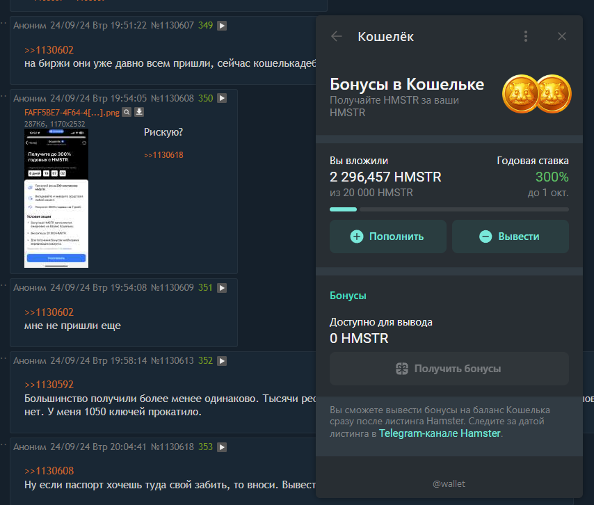>>1131115 Телеграм кошель, переводишь хомяка в USDT и продаешь на p2p, а можешь под 300% если веришь в успех монетки, заебись же, зачем эта ебля с биржами