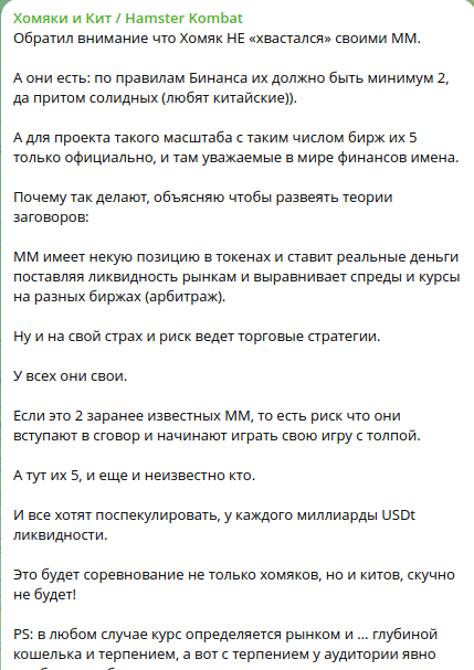 1. Хамстер будет каждый день пампиться элитным чатом китов на 1000 человек на 10 битков. 2. В день в хамстера будет заливаться 10000 биткоинов. 3. Пампить будут до начала второго сезона. 4. В секретном чате китов больше 1 миллиона битков (больше чем у правительства США), вход от 1000 биткоинов. 5. Забанили только степашек из СНГ. Арабы и Индусы играли честно. 6. Стартовая капитализация будет миллиард(в момент листинга) и вырастет до 5 миллиардов в первую секунду.
