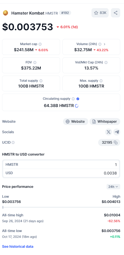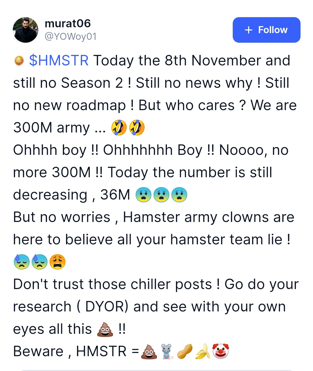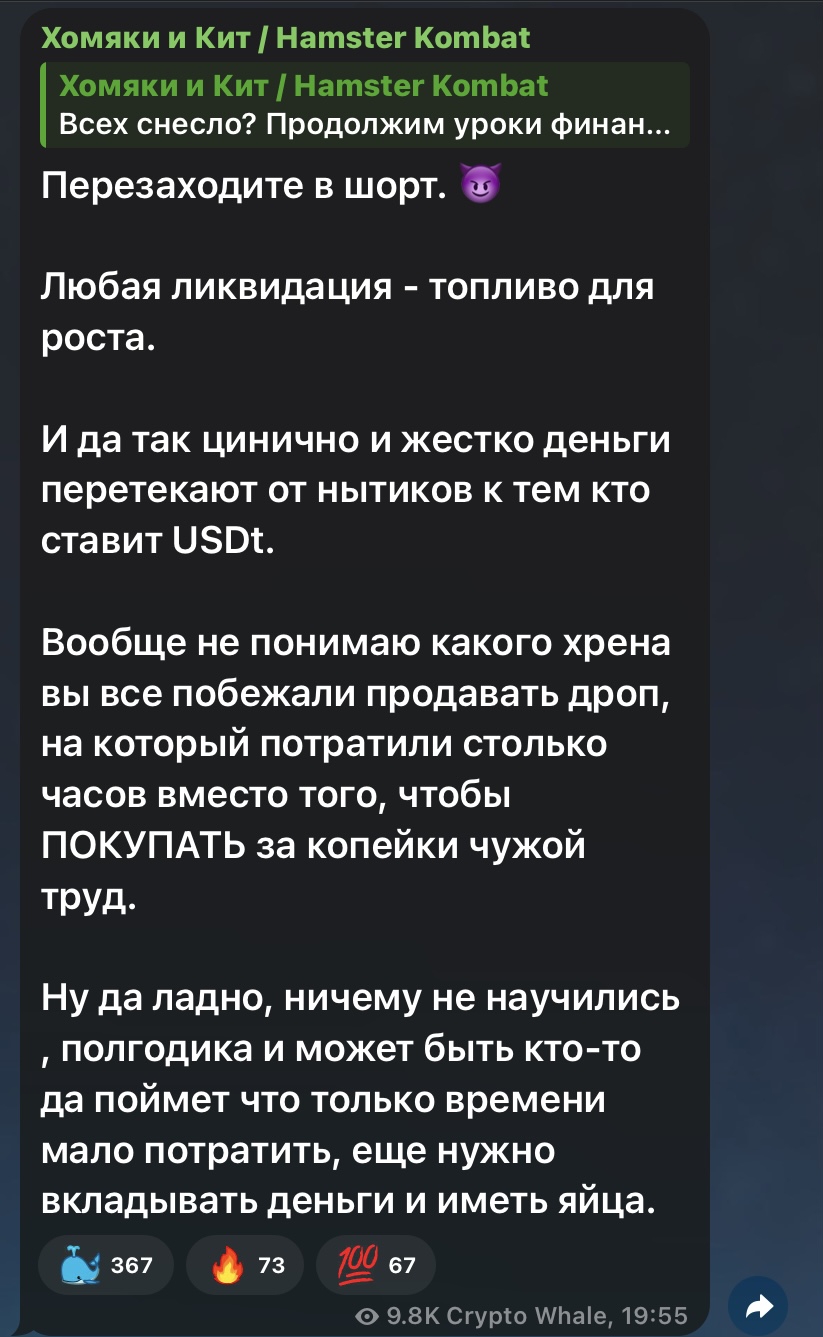 Хомяк это просто хайп. И я думаю что он не закончился вот и всё. Мне поебать на его техническую часть, на эмиссию, у кого она в руках. Я все это вижу. И все жто выглядит как скам. Но я просто допускаю мысль что история не закончена и уринович захочет еще больше бабок. Команде хомяка может слить токен в ноль и тогда все кончено. А может рисовать зеленые свечи (разными манипуляциями) и на самоподдуве привлечь хомяков