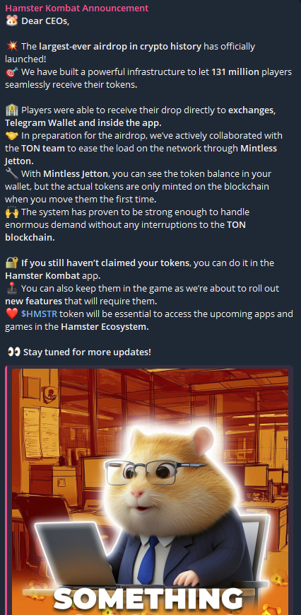 🏦 Игроки могли получать свои дропы непосредственно на биржах, в кошельке Telegram и внутри приложения. 🤝 В ходе подготовки к airdrop мы активно сотрудничали с командой TON, чтобы снизить нагрузку на сеть с помощью Mintless Jetton. 🔧 С помощью Mintless Jetton вы можете видеть баланс токенов в своем кошельке, но реальные токены майнятся на блокчейне только при первом перемещении. 🙌 Система доказала, что достаточно сильна, чтобы справиться с огромным спросом без каких-либо перебоев в работе блокчейна TON.