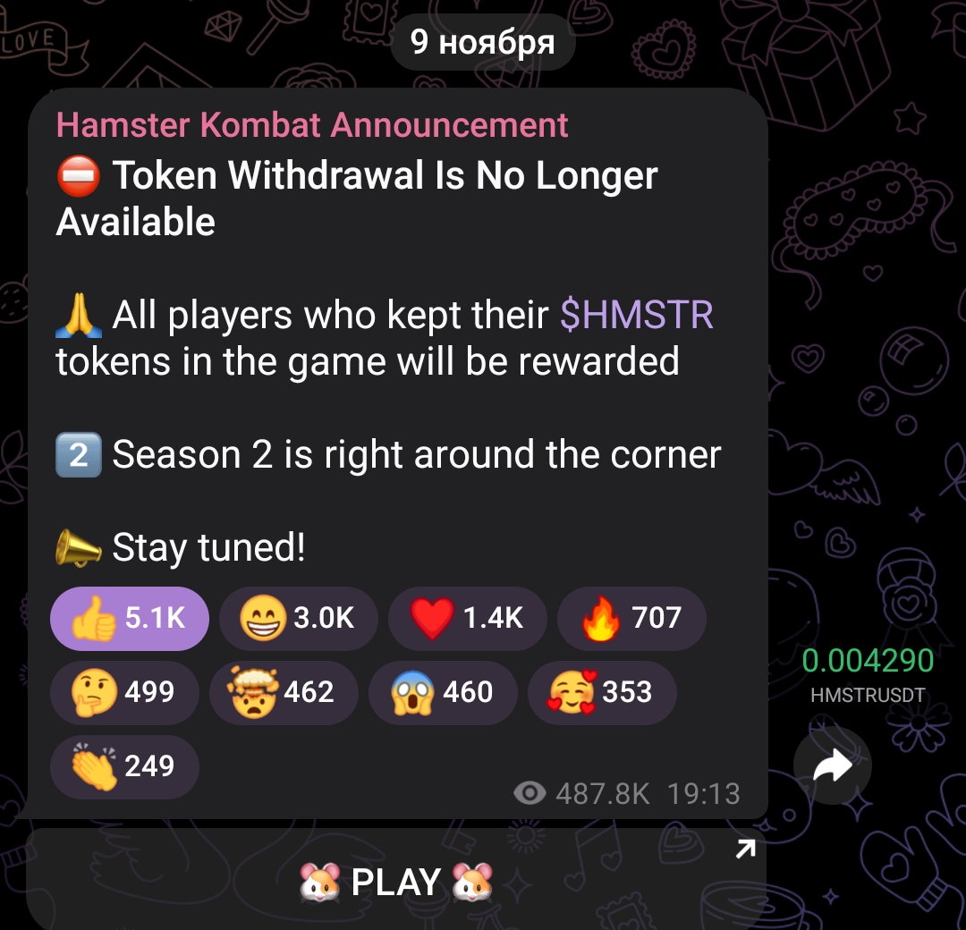 🔐 Если вы все еще не заявили о своих токенах, вы можете сделать это в приложении Hamster Kombat. 🕹 Вы также можете оставить их в игре, так как мы собираемся выпустить новые функции, для которых они потребуются. ❤️ Токен $HMSTR будет необходим для доступа к новым приложениям и играм в экосистеме Hamster.