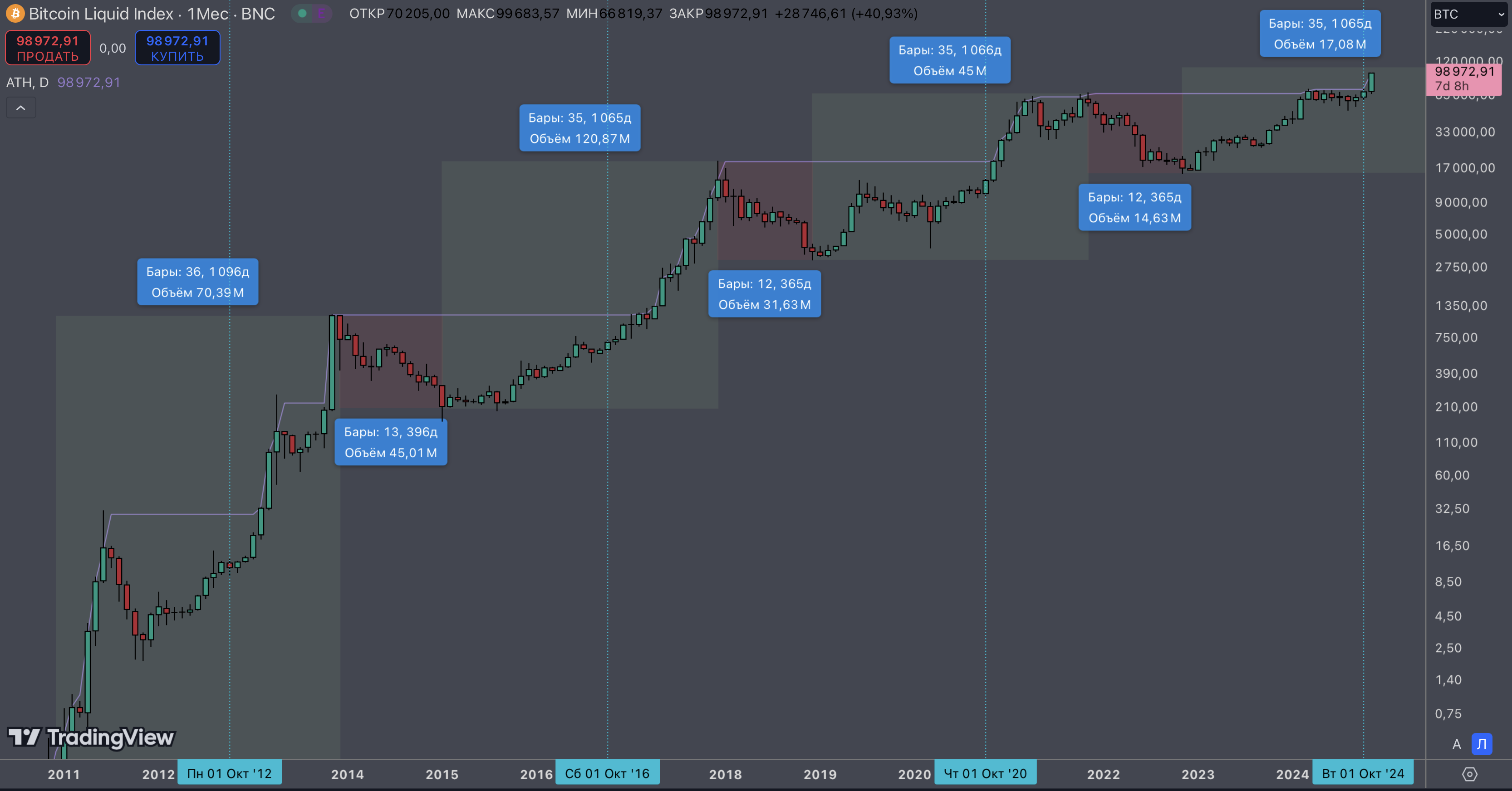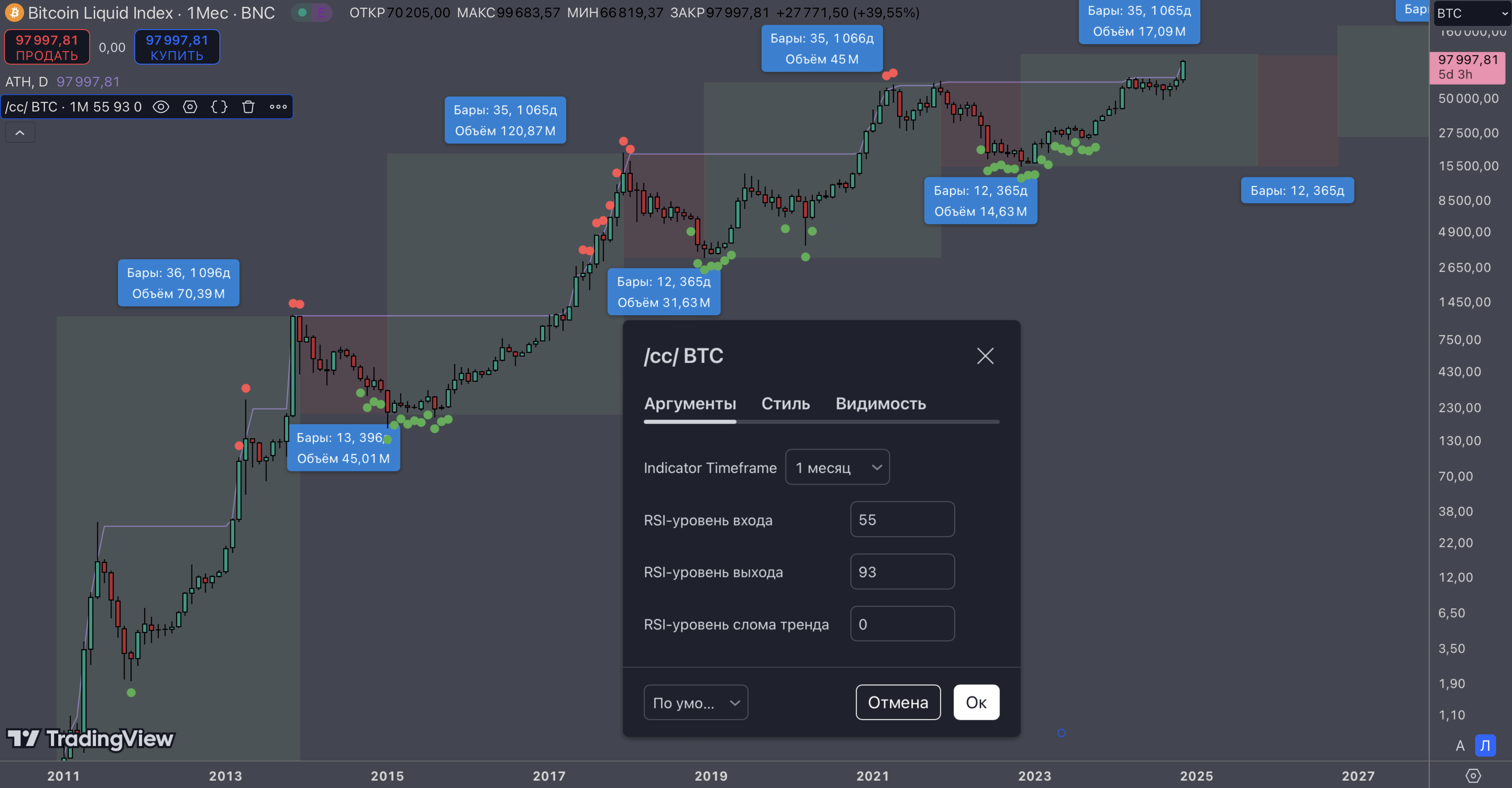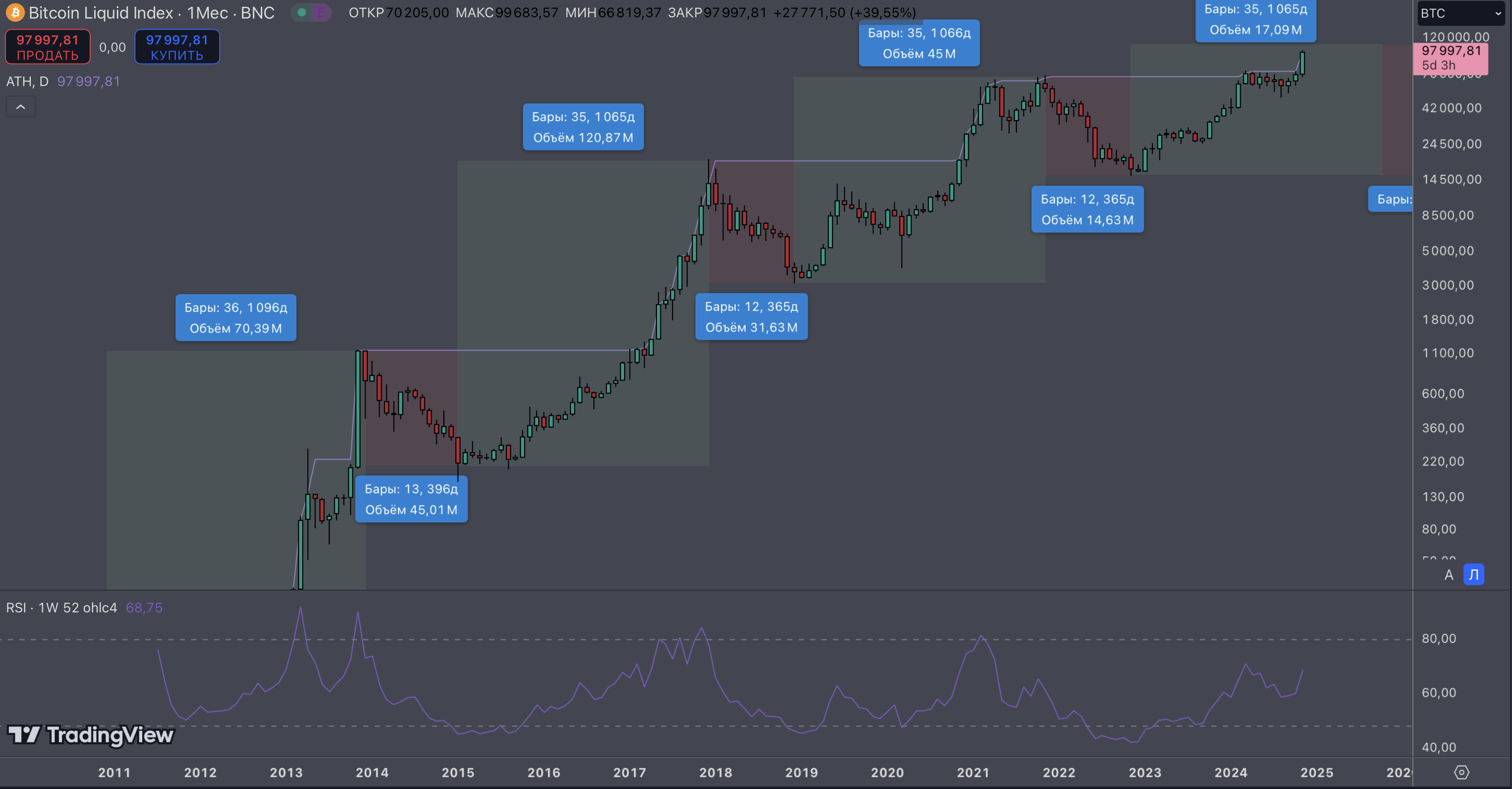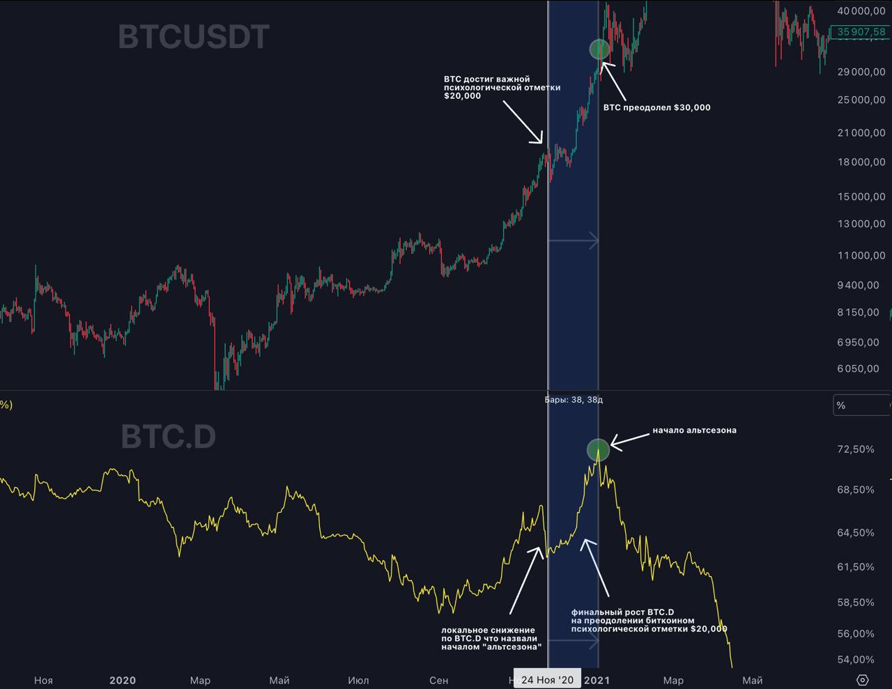 >>1164255 Да пох, если честно, как в ближайшее время будет ходить цена, если весной в любом случае будут иксы. Вообще ниже недельного ТФ опускать не вижу смысла, что при закуп_очке, что при продажах. Закупать-продавать, в принципе, вообще на месячных свечах планирую в следующем цикле. Как видно на скрине, в апреле-июне месячная свеча всегда либо додж рисует, либо небольшая красная, вот на такой свече я и фиксану половинку портфеля, так как почти всегда за этим следует коррекция по битку и, соотвественно, альте.