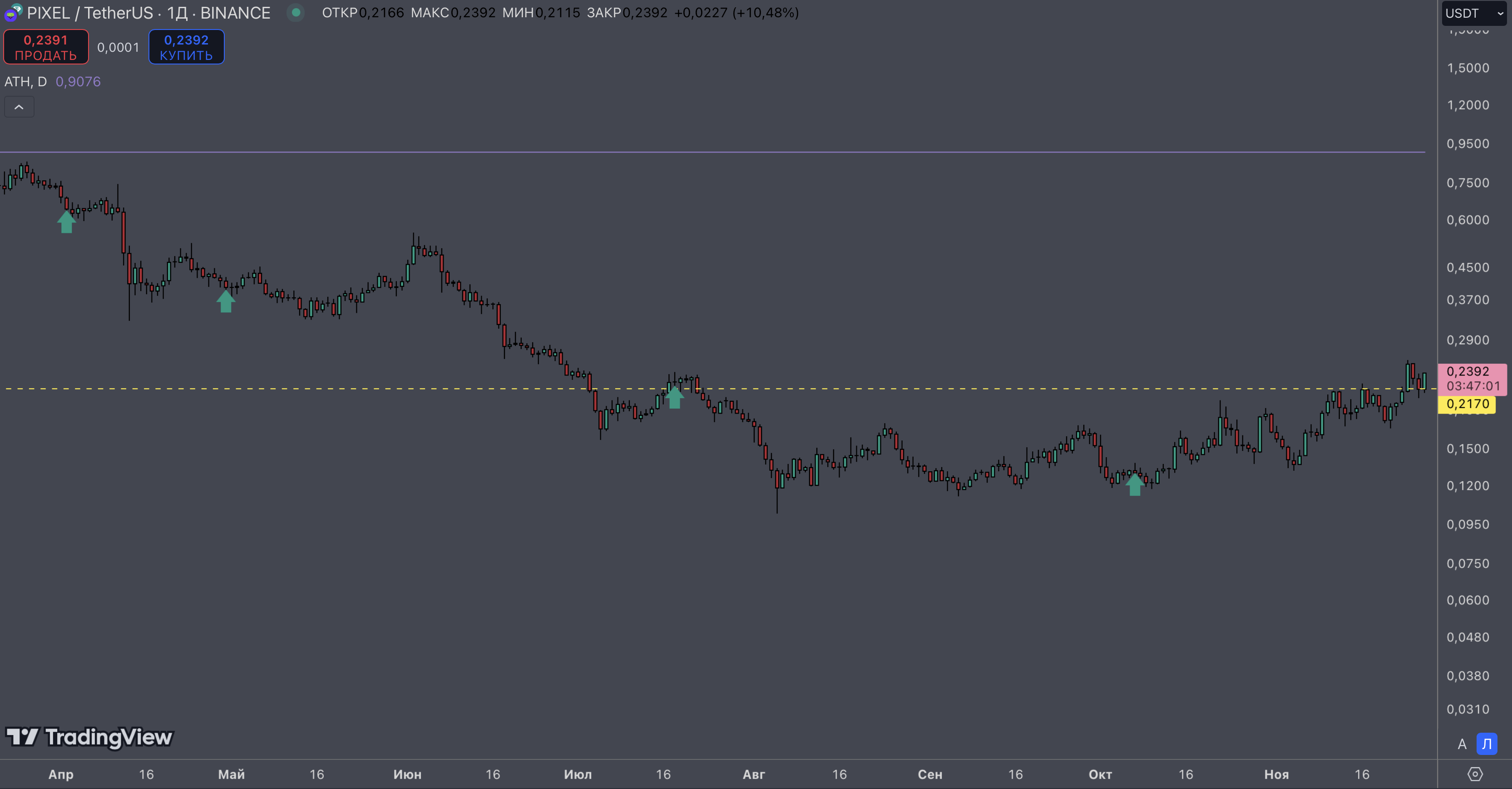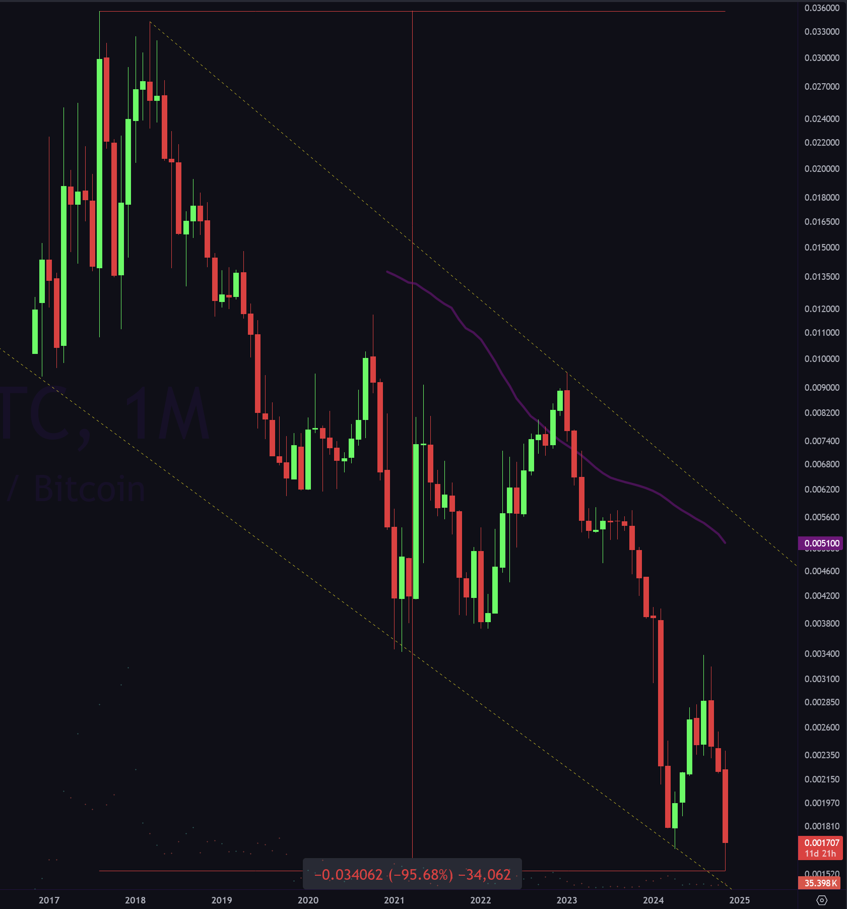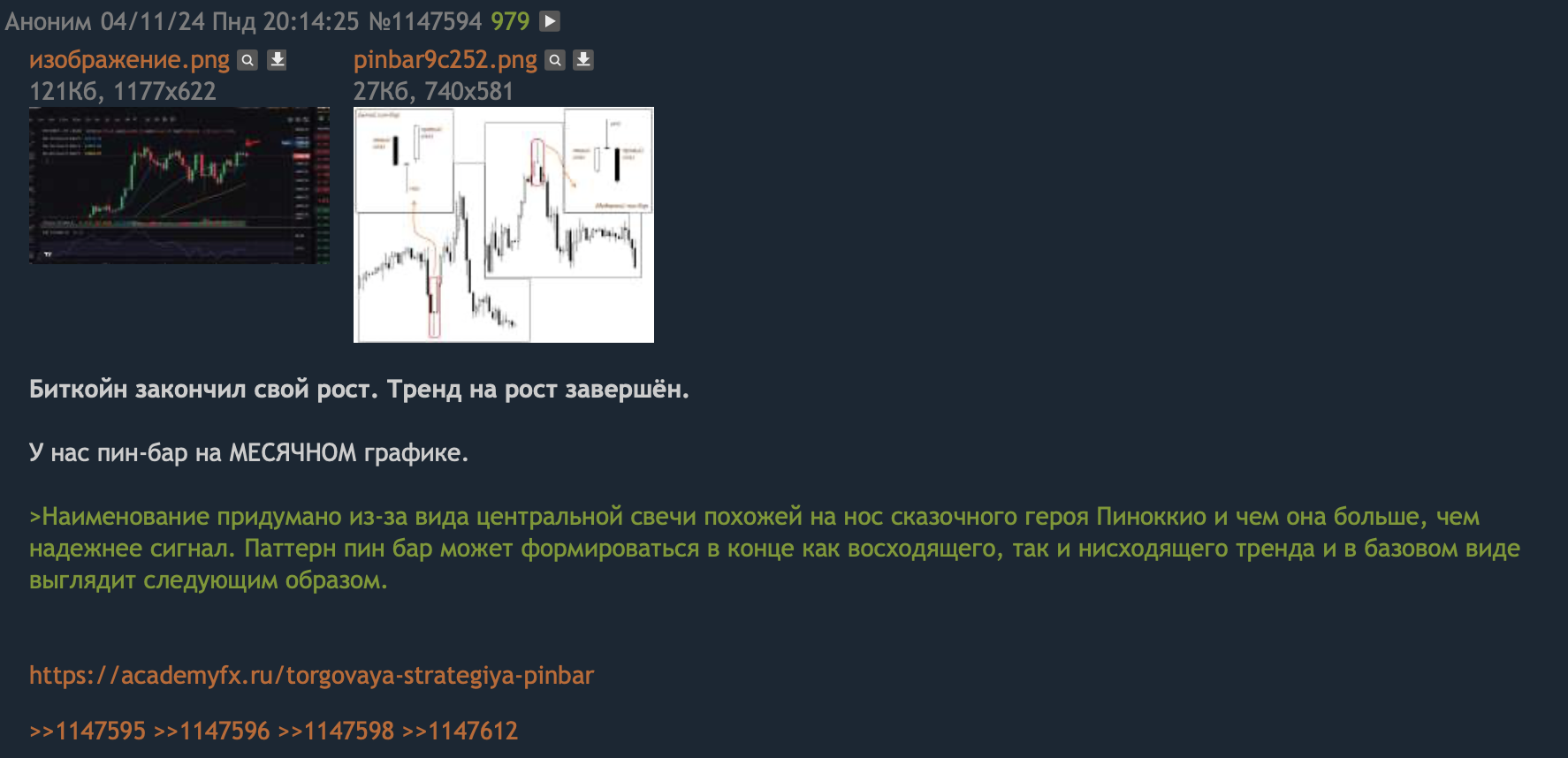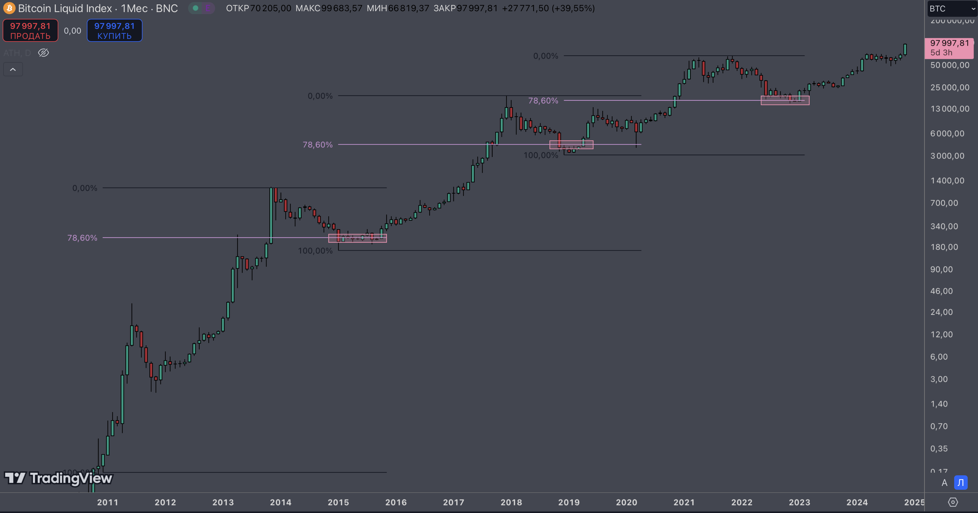 >>1164255 Да пох, если честно, как в ближайшее время будет ходить цена, если весной в любом случае будут иксы. Вообще ниже недельного ТФ опускать не вижу смысла, что при закуп_очке, что при продажах. Закупать-продавать, в принципе, вообще на месячных свечах планирую в следующем цикле. Как видно на скрине, в апреле-июне месячная свеча всегда либо додж рисует, либо небольшая красная, вот на такой свече я и фиксану половинку портфеля, так как почти всегда за этим следует коррекция по битку и, соотвественно, альте.