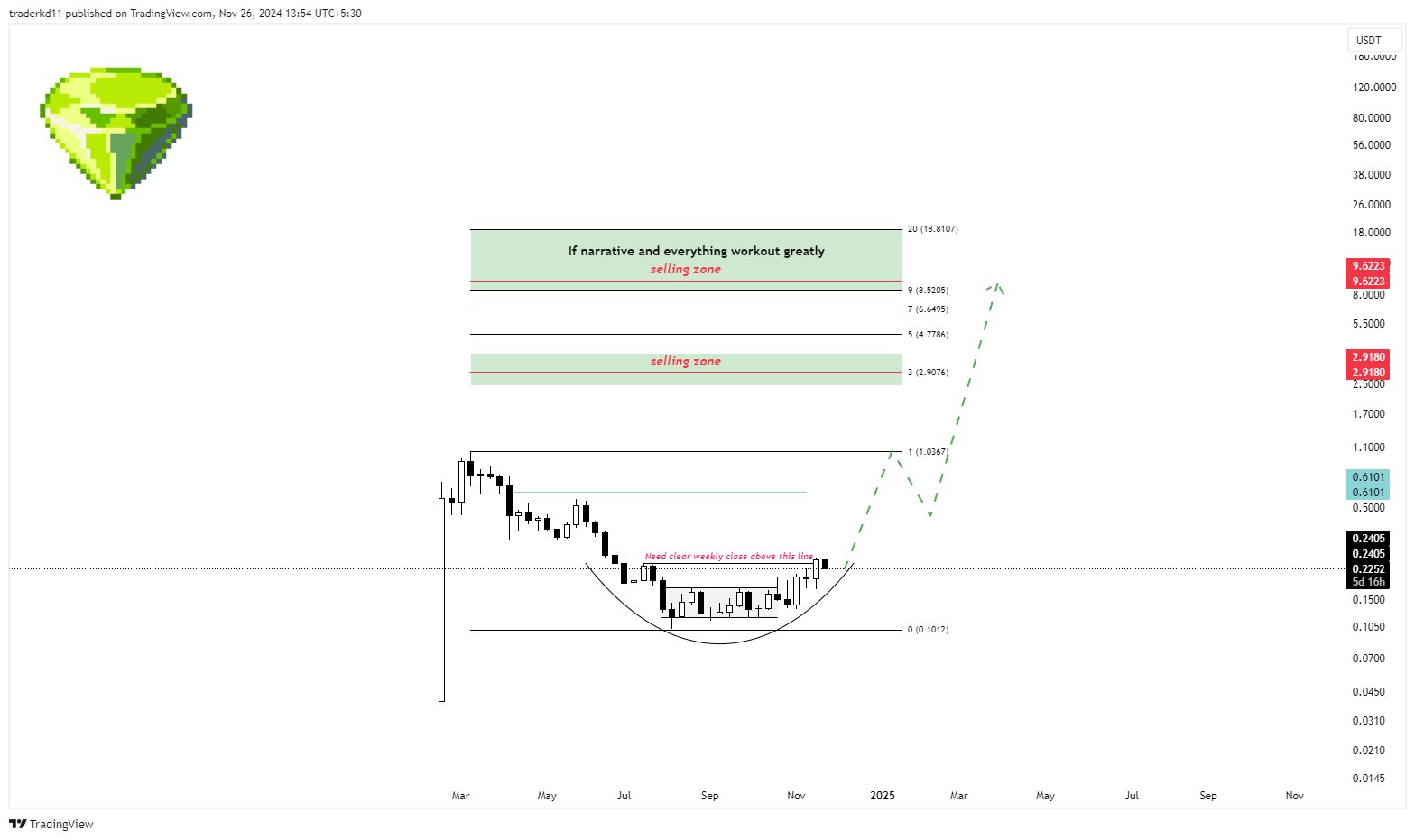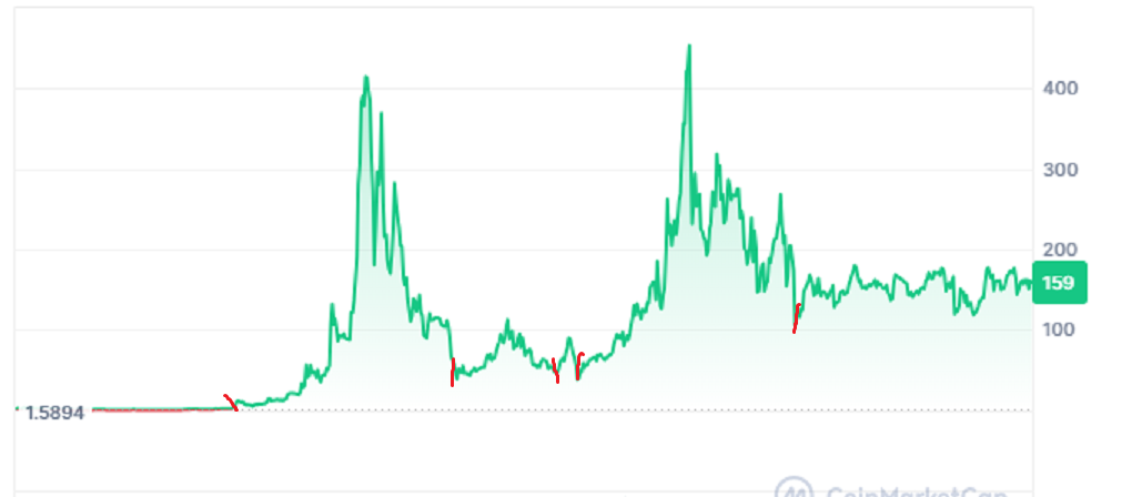 Я спиздил у Трейдера 80/20 и Пифагора довольно рабочий способ определить минимальный рост говнины в цикле – достижение 23.6 фибы от АТХ прошлого цикла до дна текущего. Я ручками чекнул в своё время эту тему на сотне топов СМС, у которых есть достаточно истории, и это не сработало что-то около 2, или 3 раз, при чём даже в эти разы цена доходила довольно близко к 23.6. На эти цели я и ориентируюсь, когда прикидываю в голове потанцевальные иксы по всему портфелю в конце бычки.