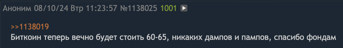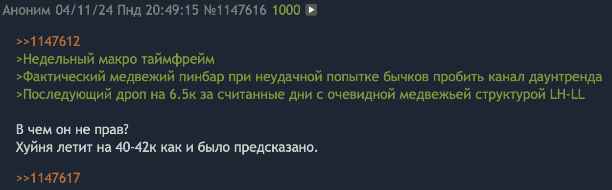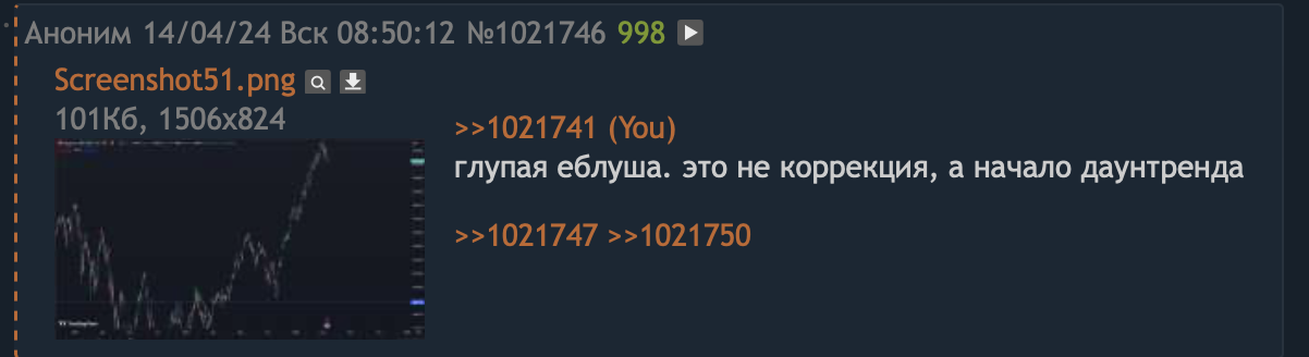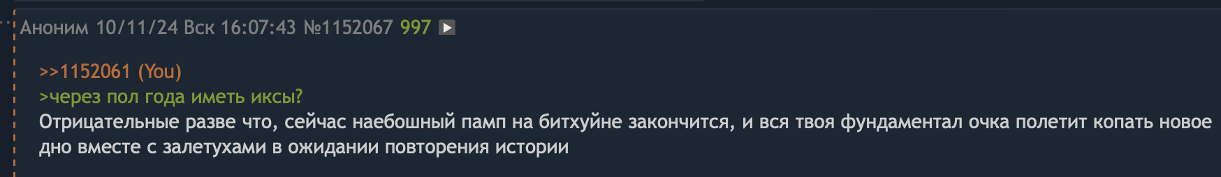 >>1165991 Мелкие коррекции я не могу ванговать, это обычная волатильность. До ноября 2025 дед будет расти, существует вариант мощной коррекции более 20% на 2-3 месяца летом, как это было в прошлом цикле из-за новостного фона от инсектоидов уёбищных.