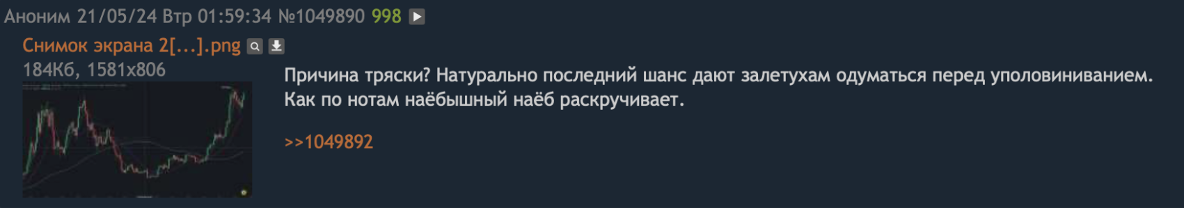>>1164273 Я думаю что даст х10-х15, по крайней мере мартовские х5-7 и текущий скачок непонятно с хуя на х2-х3 показали потанцевал. Насколько помню, в прошлый альтсезон иксовало всё на 20-30 и это считалось нормально. Ну понизим планку в два раза и вот они зоны разгрузки. Хотя может я рано радуюсь и считаю шкуры неубитых бабкашизов.