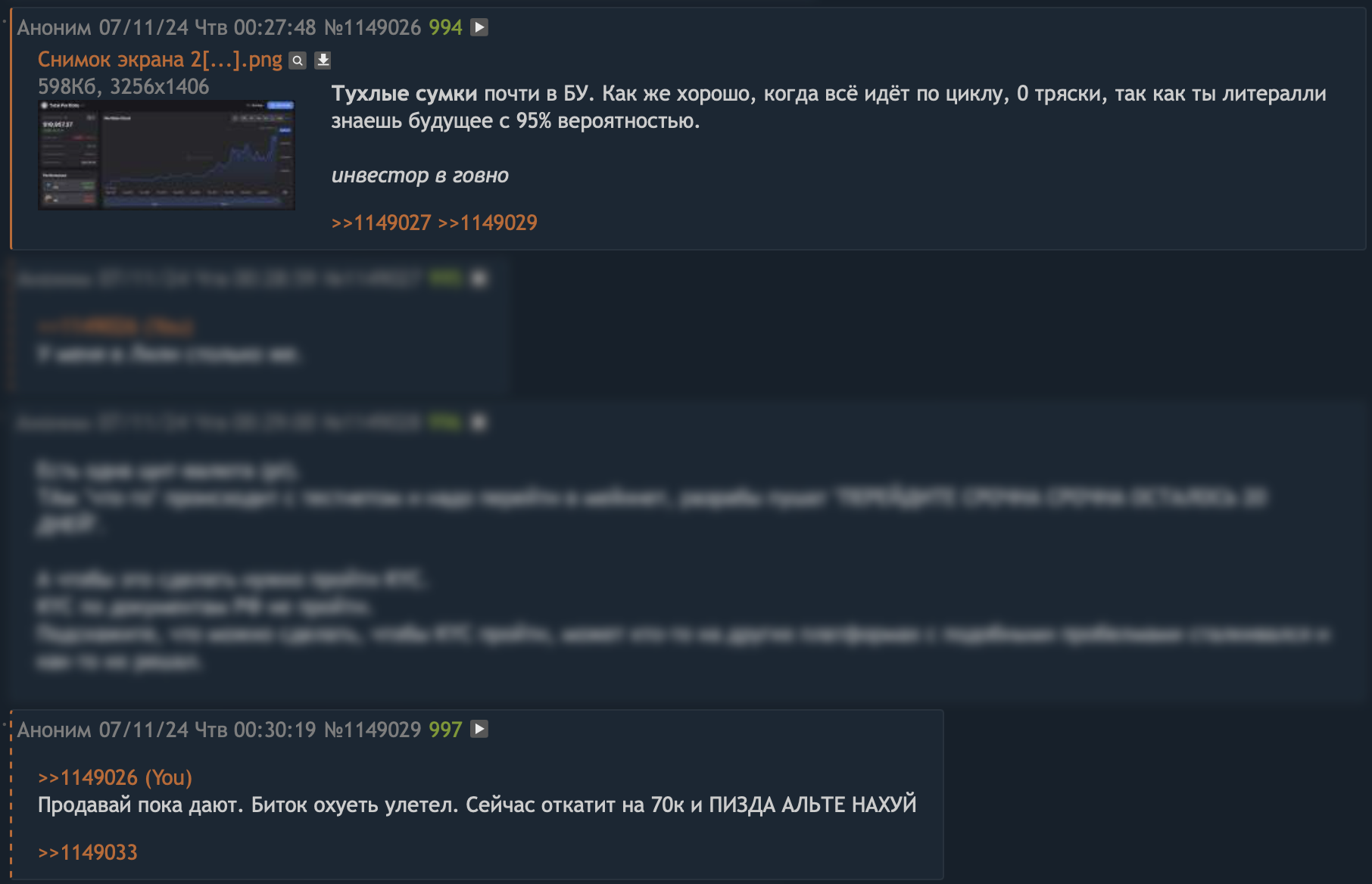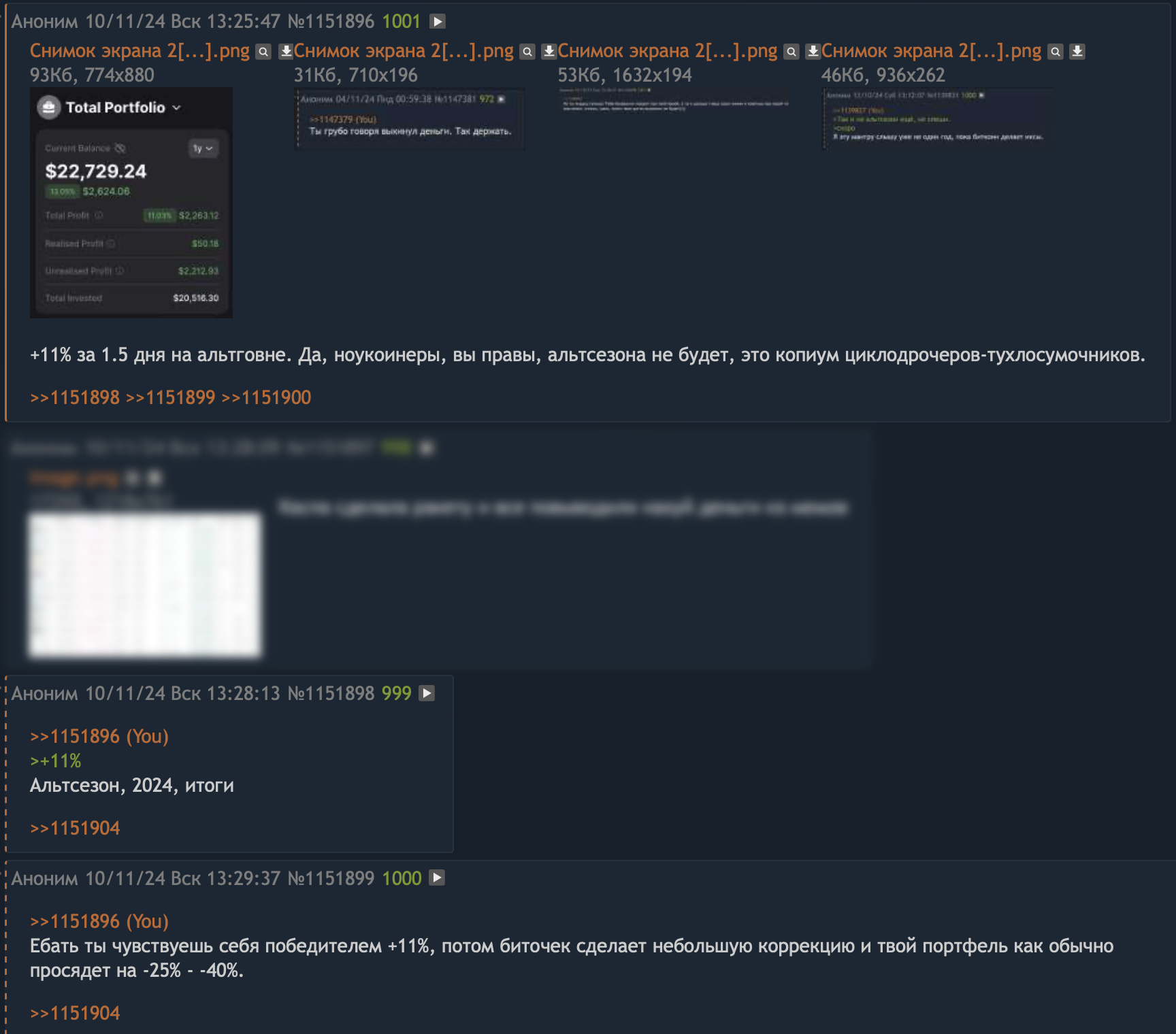 Я инвестор в говно из треда тупых вопросов, первый раз нюхнул крипту в 2017, тогда чисто по приколу купил деда и кефира на 300 баксов, вывел 700. Второй раз пришёл в феврале 2020 с мриями трейдить каждый день фьючами и поднимать по 1-10% в сутки к депозиту, выдумывал охуительные стратегии, подходы, индикаторы писал себе итд, конечно же в мартеце 2020 часть позиций ликвиднуло, но это не вразумило меня и я продолжил. Естественно, на бычьем рынке после мартеца я успешно лонговал, рассказывая в треде, что трейдинг это изи кнопка бабло, ведь я поднимаю иксы, в какой-то момент перешёл с фьючерсов на скамные BEAR/BULL токены ФТХ, если кто помнит, то они by design оказались вечно падающими, в них у меня зависли натрейженые 12к. "Ничего, может потом отрастут и выйду", подумал я. А затем ФТХ скаманулась целиком. Таким образом я купил главное знание – на дистанции инвестор всегда ебёт трейдера, всегда. Соотвественно, 2.5 года я инвестор, к сожалению, на момент начала весной 2022 я не знал про циклы, так что покупал частями альту, вместо того, чтобы подождать пол года до осени 2022 и купить дно деда по циклам, а осенью 2024 переобуться в альту перед альтсезоном. Но, даже так, на данный момент совокупный результат по трём моим портфелям = +30-40%, из которых основной портфель, который начал набирать 2.5 года назад, почти х2, а остальные два портфеля чуть выше БУ. Фиксироваться буду на половину портфеля весной 2025, остаток закрою осенью 2025, так как там будет разворот на медвежку. С текущего цикла планирую вытянуть минимум х4.