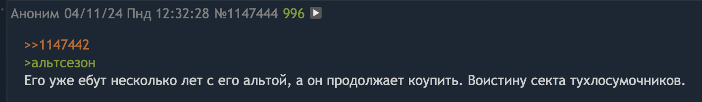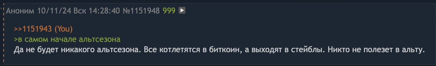 А я напоминаю, что в 2020 (год халвинга) с ноября по конец декабря была финальная жёсткая ёбка альты. И альтсезон только в январе наступил. Перед финальной ёбкой тоже был небольшой рост.