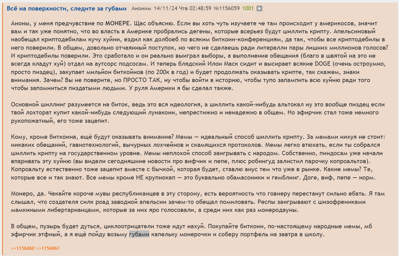 >>1183599 Убойные дозы копиума. Почему ты думаешь, что монеро в принципе будет легальной в будущем? Без вливаний крупного капитала в нее (чтобы стала привлекательной для быстрого заработка и так обрела первый массовый адопшн) или проталкивания со стороны государства (которому дупу пече дуже славно от неконтролируемого рынка под носом) простому обывателю будет на монеро похуй, ведь обычный кэш и безнал достаточно хороши, а связать собственное отсутствие приватности с непопулярными решениями политиков - это надо немножко подумоть, да и то удобство и привычность перевесят такие абстрактные материи.