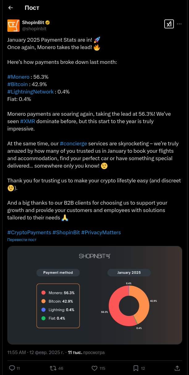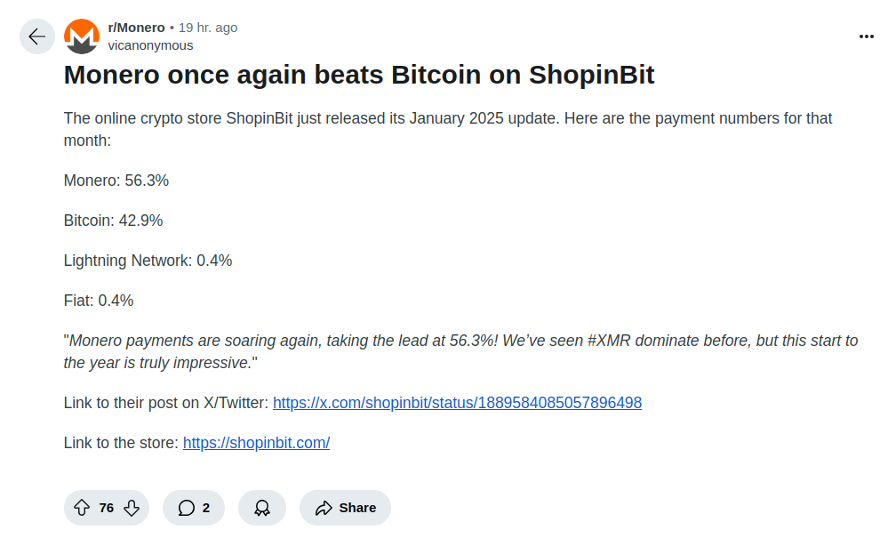 Европейский интернет-магазин ShopinBit, принимающий в кач-ве оплаты BTC, XMR, Fiat поделился статистикой предпочитаемых у клиентов методов оплаты. Самым предпочитаемым оказался XMR.