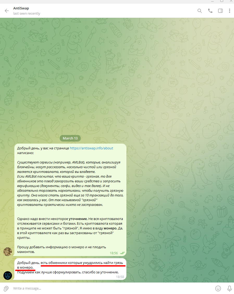Пацаны, я обратился в поддержку https://antiswap.info/about с целью исправить их страничку и добавить информацию про монеро. И знаете, что они мне ответили? Что НЕКОТОРЫЕ ОБМЕННИКИ СЧИТАЮТ НЕКОТОРУЮ МОНЕРУ ГРЯЗНОЙ.