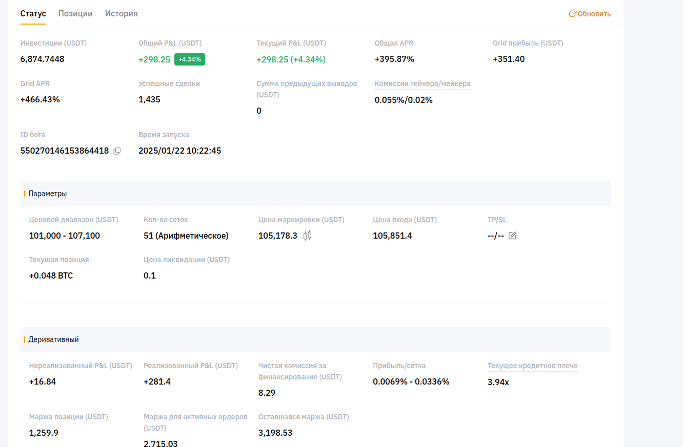 Я меньше недели назад вкатился, вот так на битке пока пробую, в первые пару дней он давал в сутки более 1%, сейчас волатильность упала, нихуя не приносит. Я думаю, что нужно переставлять сеточки каждую неделю, ибо мета меняется очень быстро. Ну и комиссии пиздец, 33% прибыли с сетки уходит на комиссии, ну и еще у меня такие комиссии большие из-за низкого расстояния между гридами, около 0,11% расстояние такие дела.