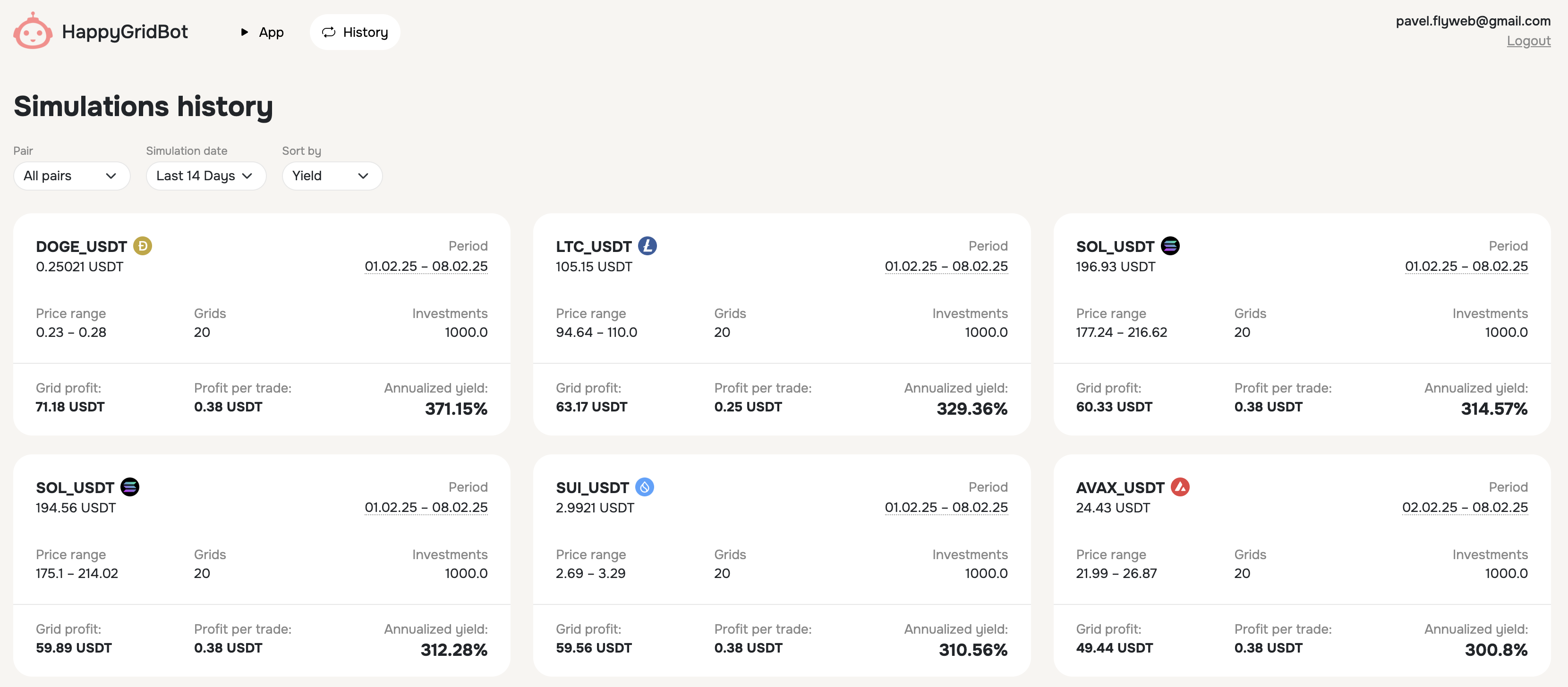 Добавил регистрацию. Для зареганных юзеров доступна история бектестов, где можно отсортировать по грид-прибыли или годовой доходности)
