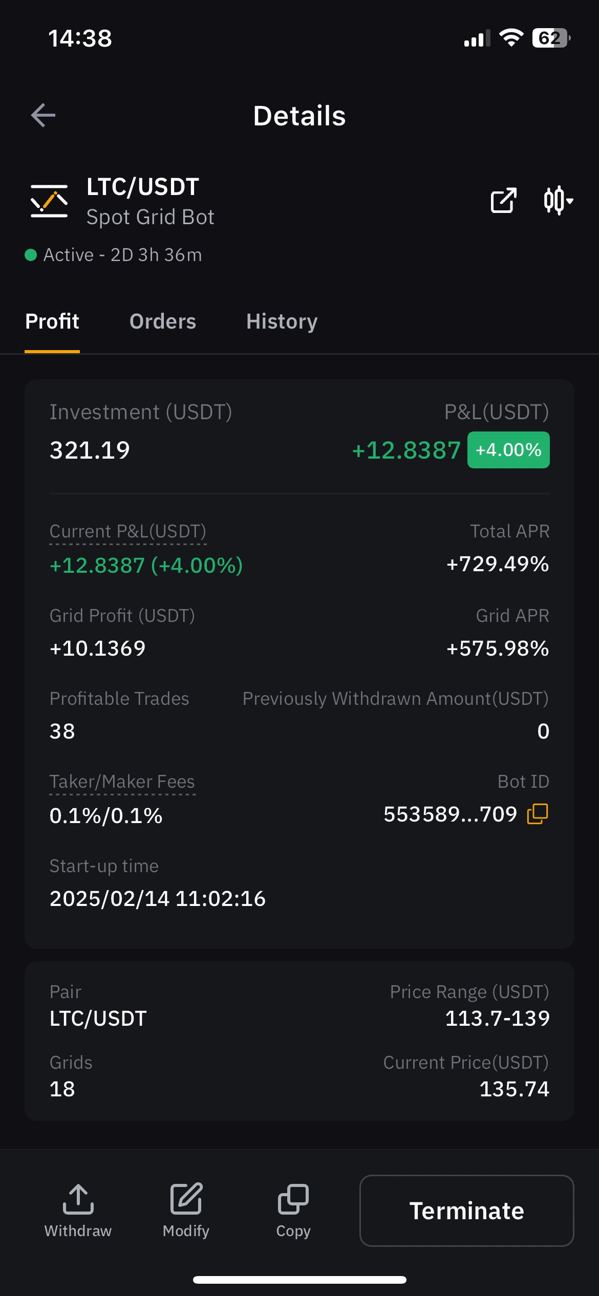 Поэтому: - стоп лосс я не ставлю, потому что запускаю ботов только на том, что (по-моему) будет расти в долгосроке. Никаких мемкойнов, только Layer 1 Если уходит ниже лимита – жду когда вернется или стопаю бота без продажи монеты. И просто жду нормальной цены для выхода