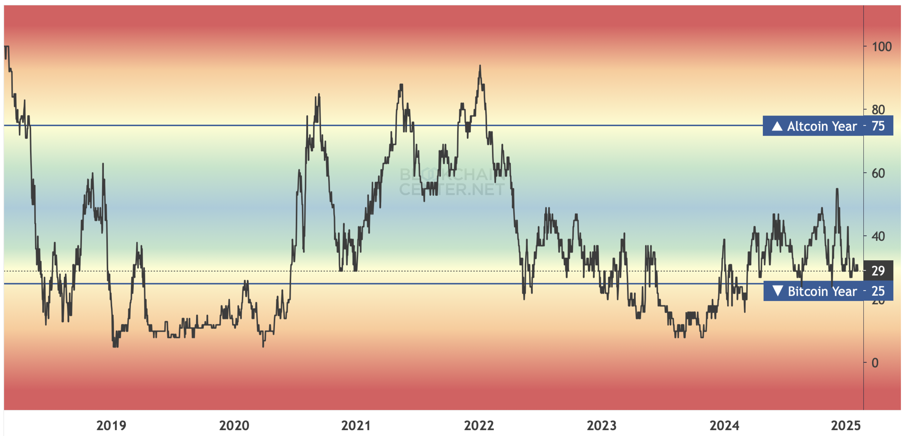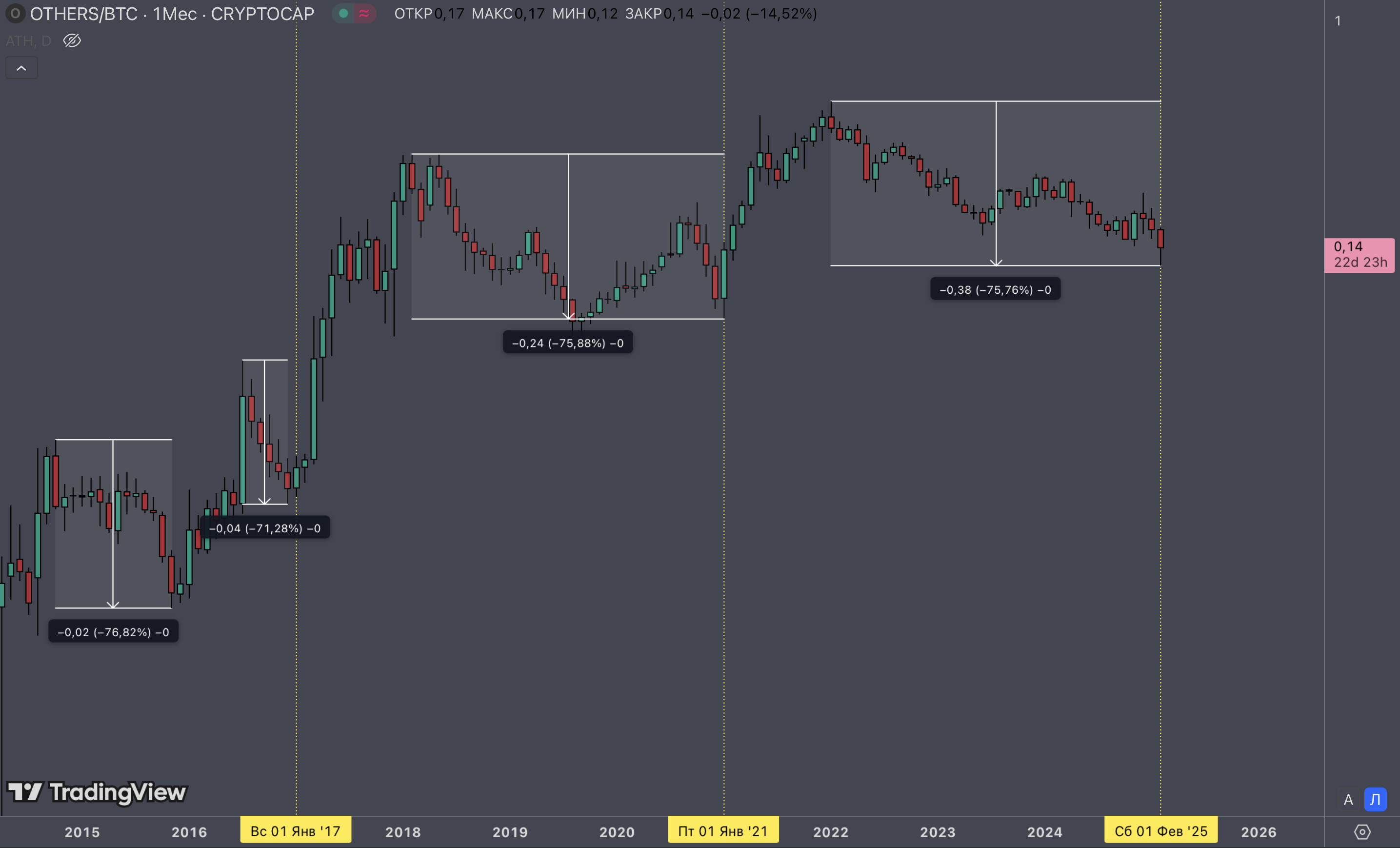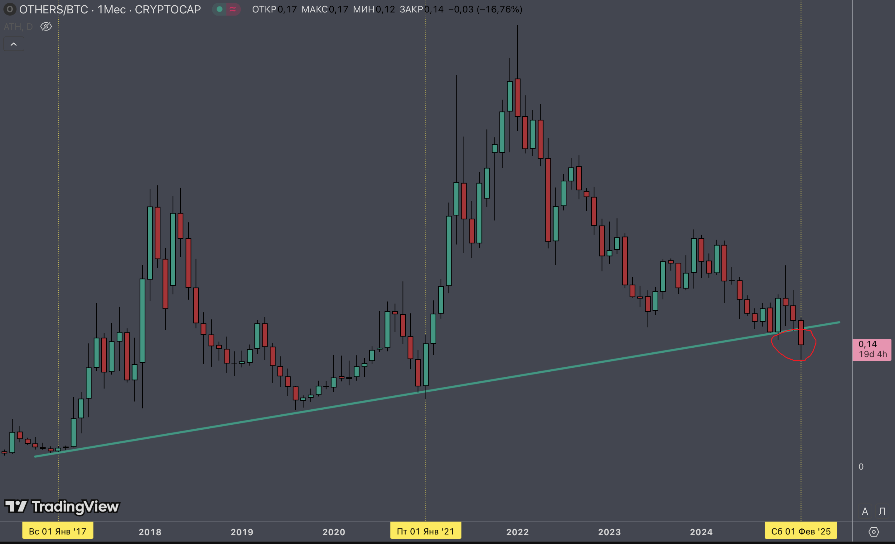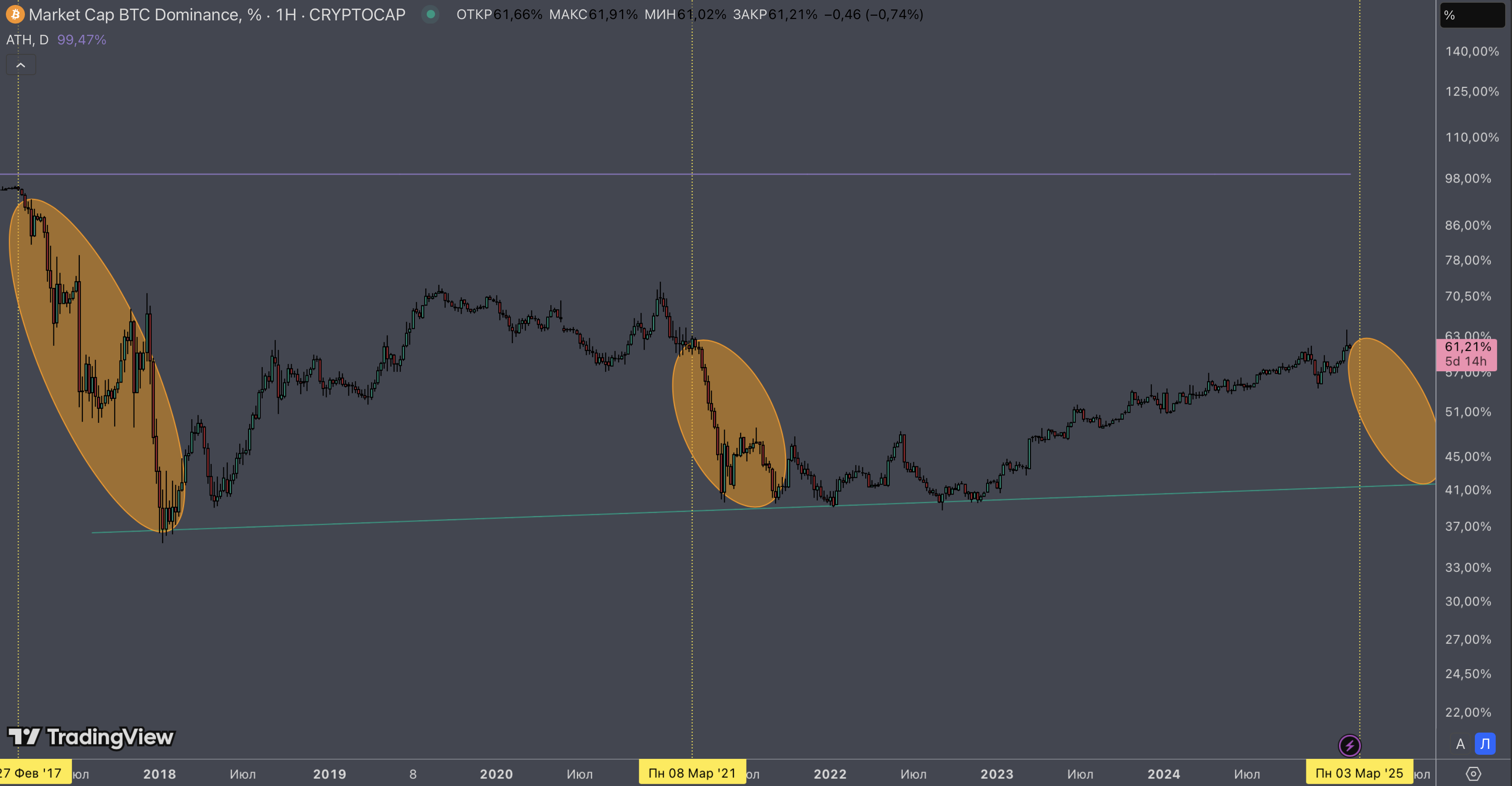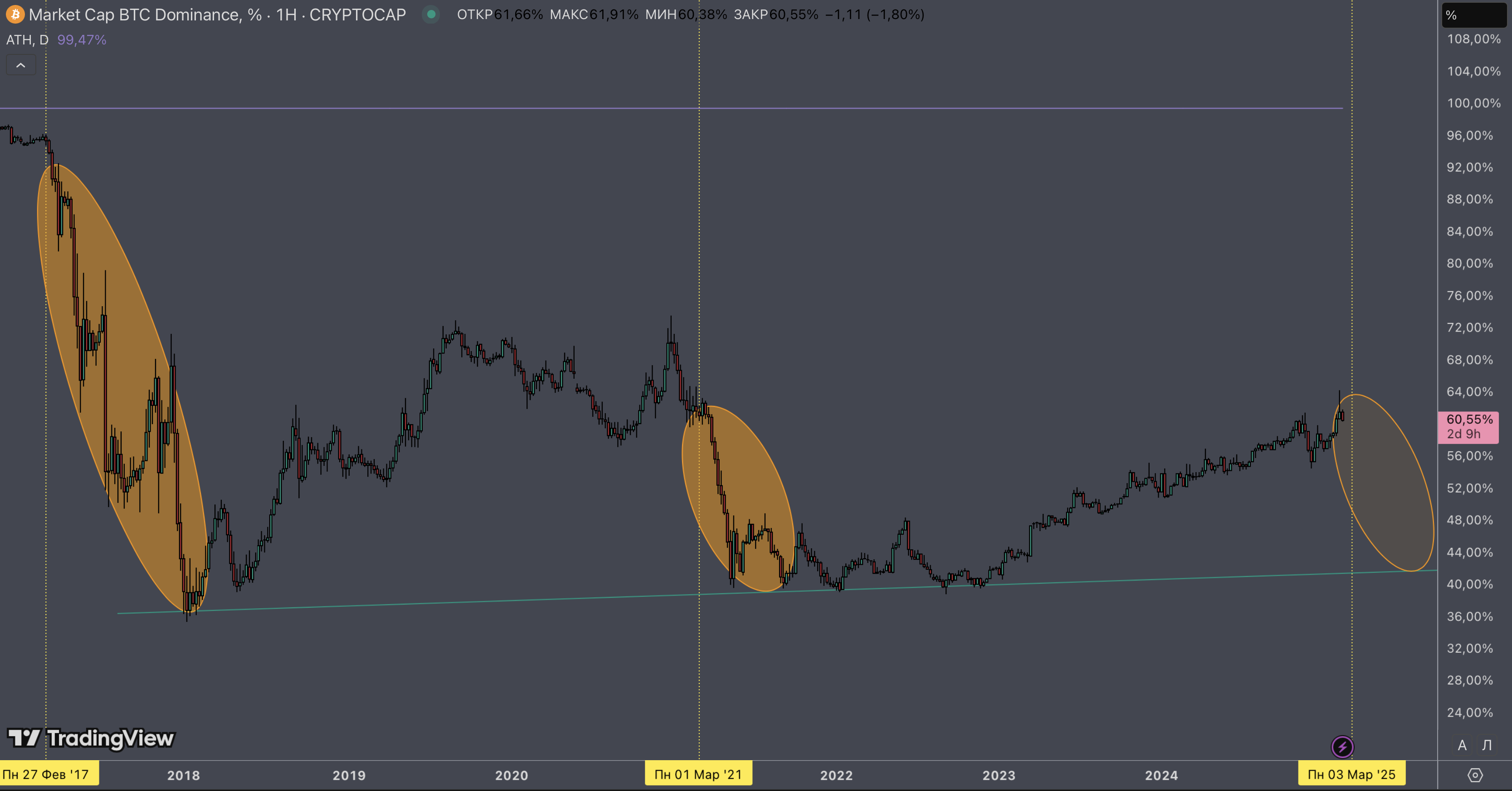 В позапрошлый цикл стабильный обвал доминации начался в конце февраля-начале марта, в прошлом цикле тоже, но, перед этим был дополнительный сильный дамп в январе, я ожидал, что пойдём по прошлому циклу и доминация начнёт падать в январе, но, выходит падение в январе на том цикле было исключением, а правилом является конец февраля-начало марта, как в обоих циклах до этого. Так что ждать осталось +- месяц, который очень быстро пролетит.