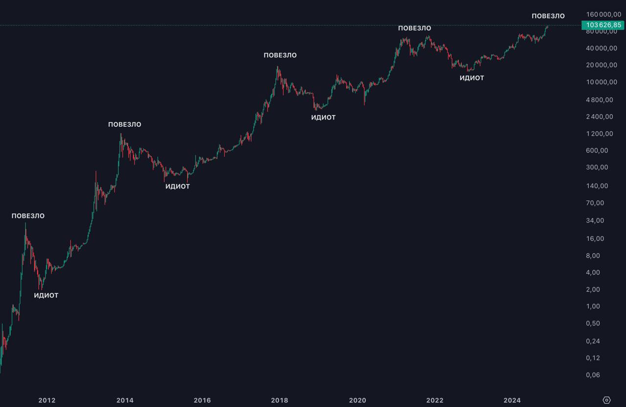 А вообще, вам не кажется странным, что все эксперты солидарны в том, что есть некий манипулятор, который отрисовывает циклы. Но этот манипулятор настолько тупой, что будет бесконечно повторять под копирку четырехлетний цикл, чтобы в 2025 даже твоя бабушка знала, что сейчас надо покупать альткоины, чтобы слить весной на пампе, чтобы откупить летом и слить снова на осеннем пампе.