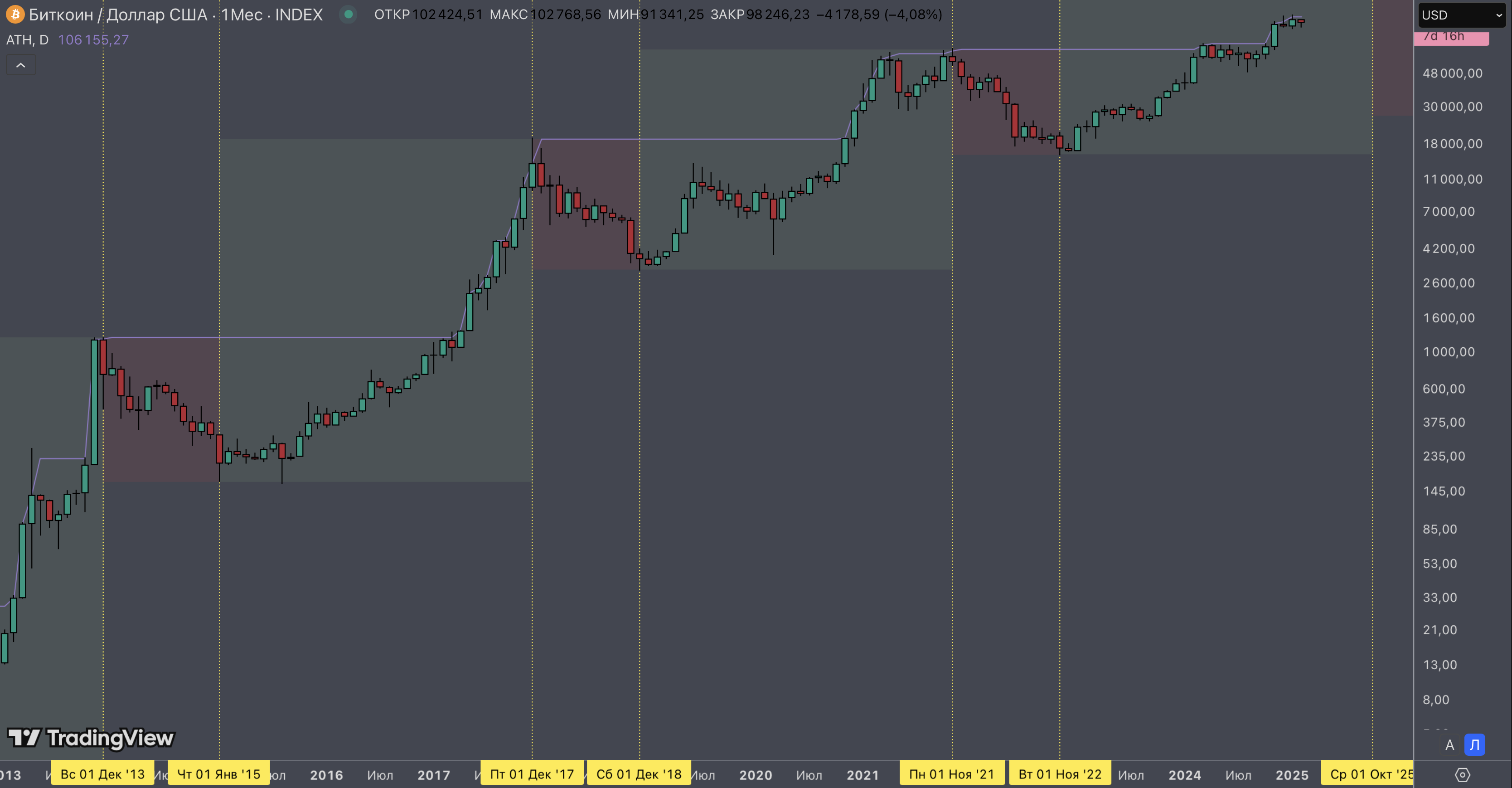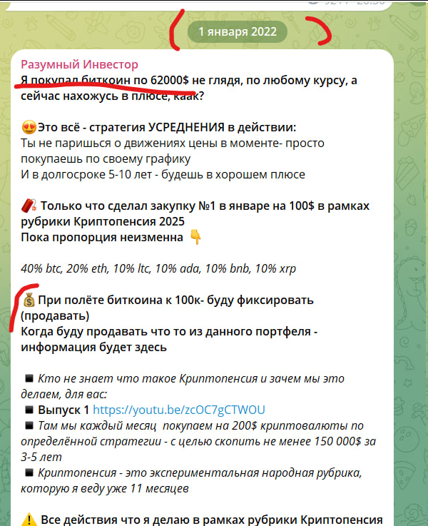Первая покупка биткоина в рамках Криптопенсии была на хаях цикла в марте 2021 года - по $58k, все эти годы мы покупали и по $65k и по $40k и по $30k и по $20k и по $16k, и всю дорогу наверх до $100k
