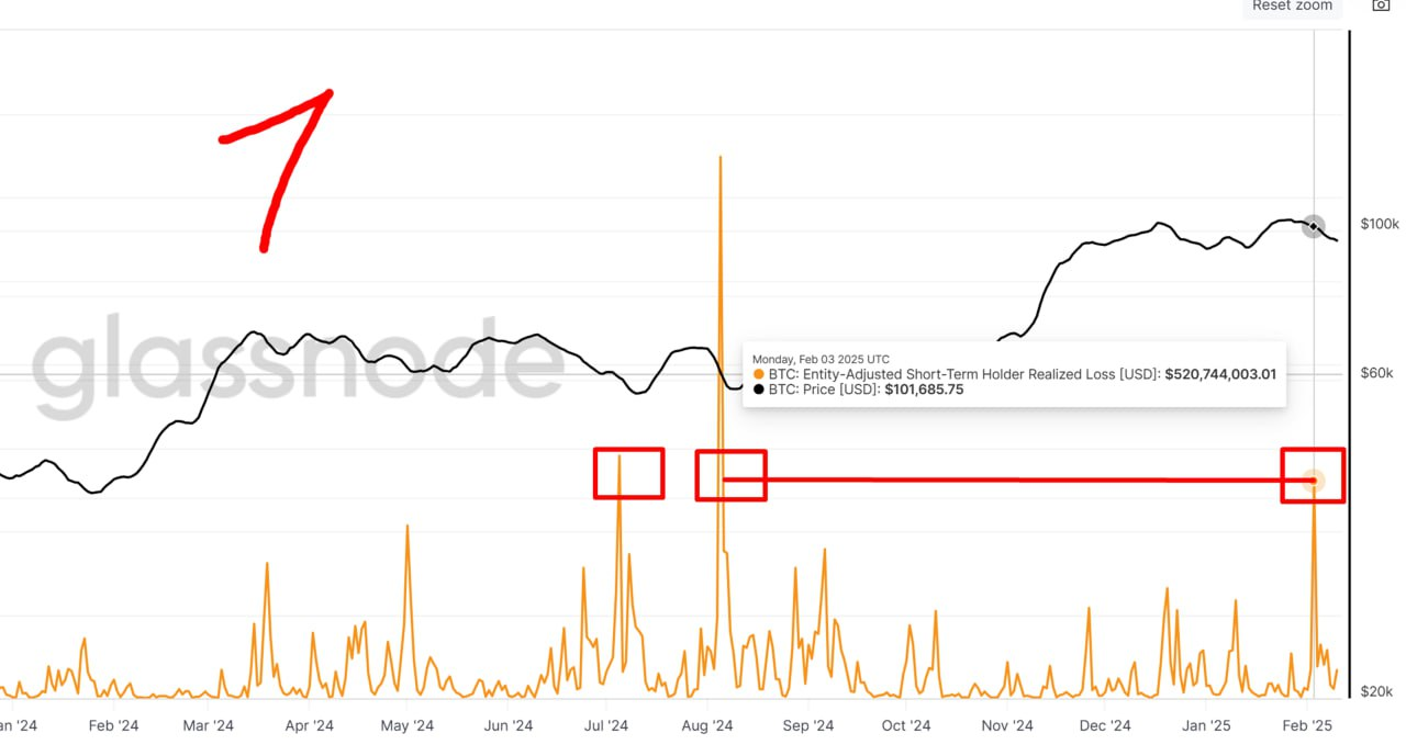 3 февраля когорта краткосрочных держателей (STH) BTC реализовала крупнейший убыток с 5 августа 2024, более чем на 500 млн $ в одном только битке