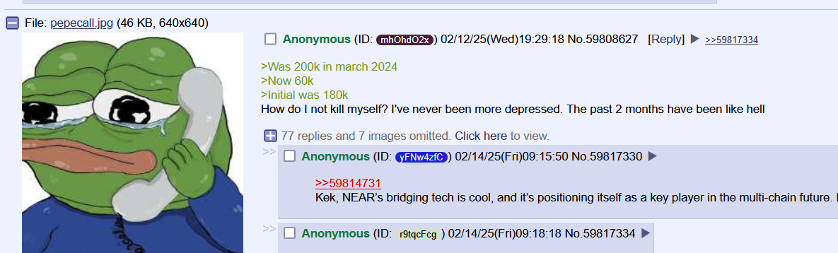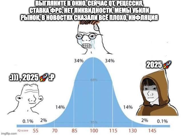 Я без шуток начинаю думать что всех эти комменты, видео на ютубе, треды на двачах заказывают маркетмейкеры, ибо можете почитать тред декабря, там все дрочат на то что альтсезон будет будет и 2-3 скептика говорят его не будет, а их потом все помоями поливают, на нах, хомяков бреют и происходит дамп. Почитайте этот февральский тред, все пишут что будет дамп и всех побреют и 2-3 скептика говорят что он будет, и их тоже говном поливают. Только суть сука в том что никто не знает что будет завтра, мб Трамп скажет «не, биткоин хуйня какая-то, меня в телеграмме скаманули» и все полетит на дно, мб ФРС скажет «не, ну алешу из Саратова надо поддержать с его сумкой альткоинов которые он держит с 2024 года, так что ставку опускаем до -10%»