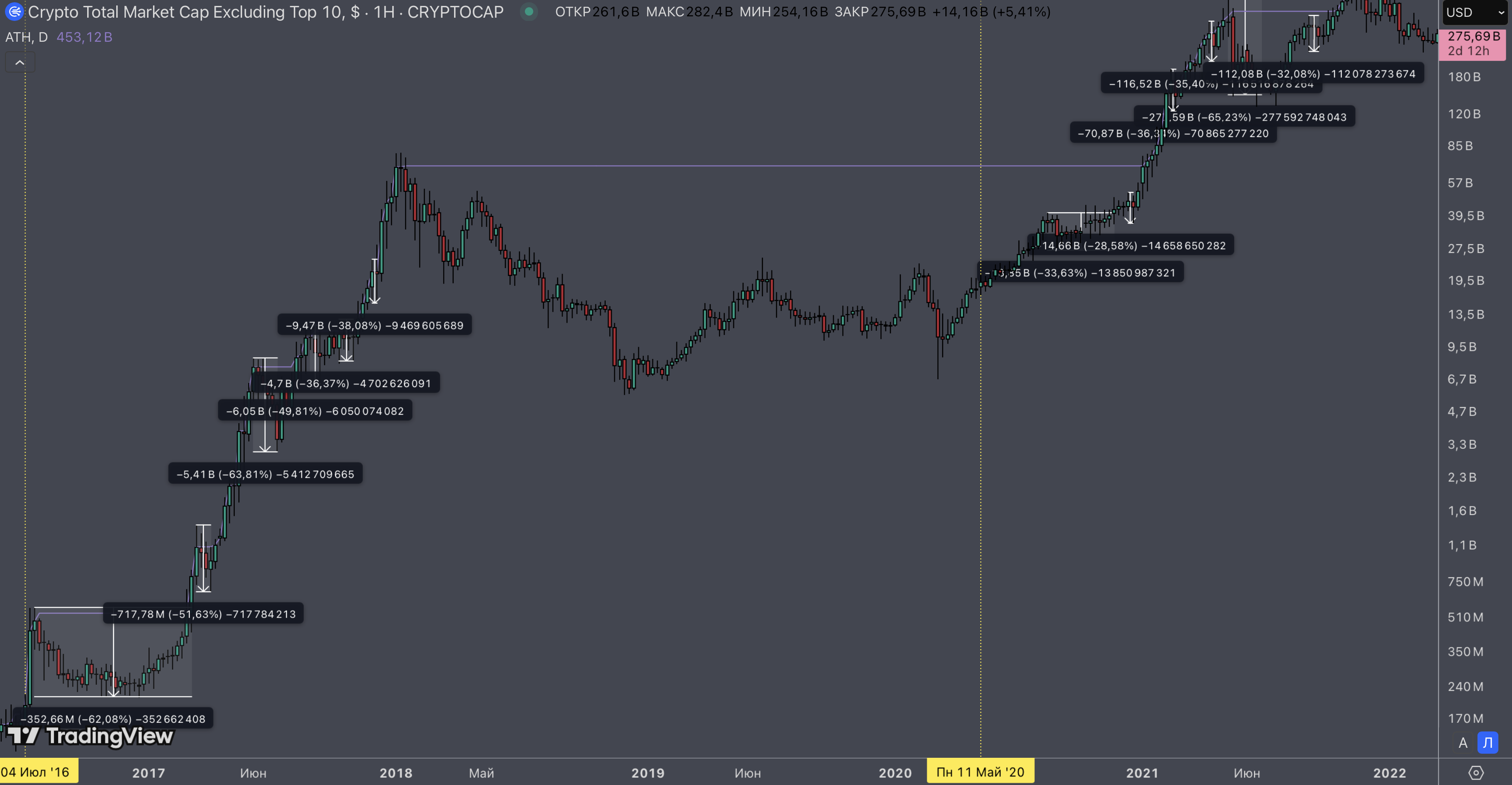 Альткоинам, конечно же, в момент падения наступит конец, да и вообще, желательно о них забыть, за исключениям топ 5-10 по капитализации.