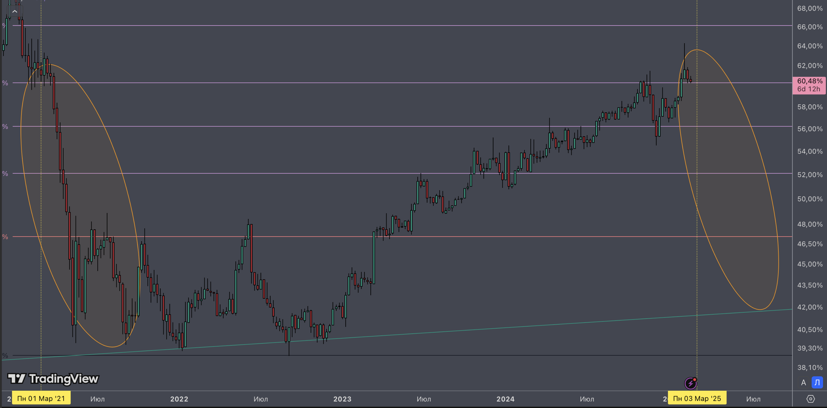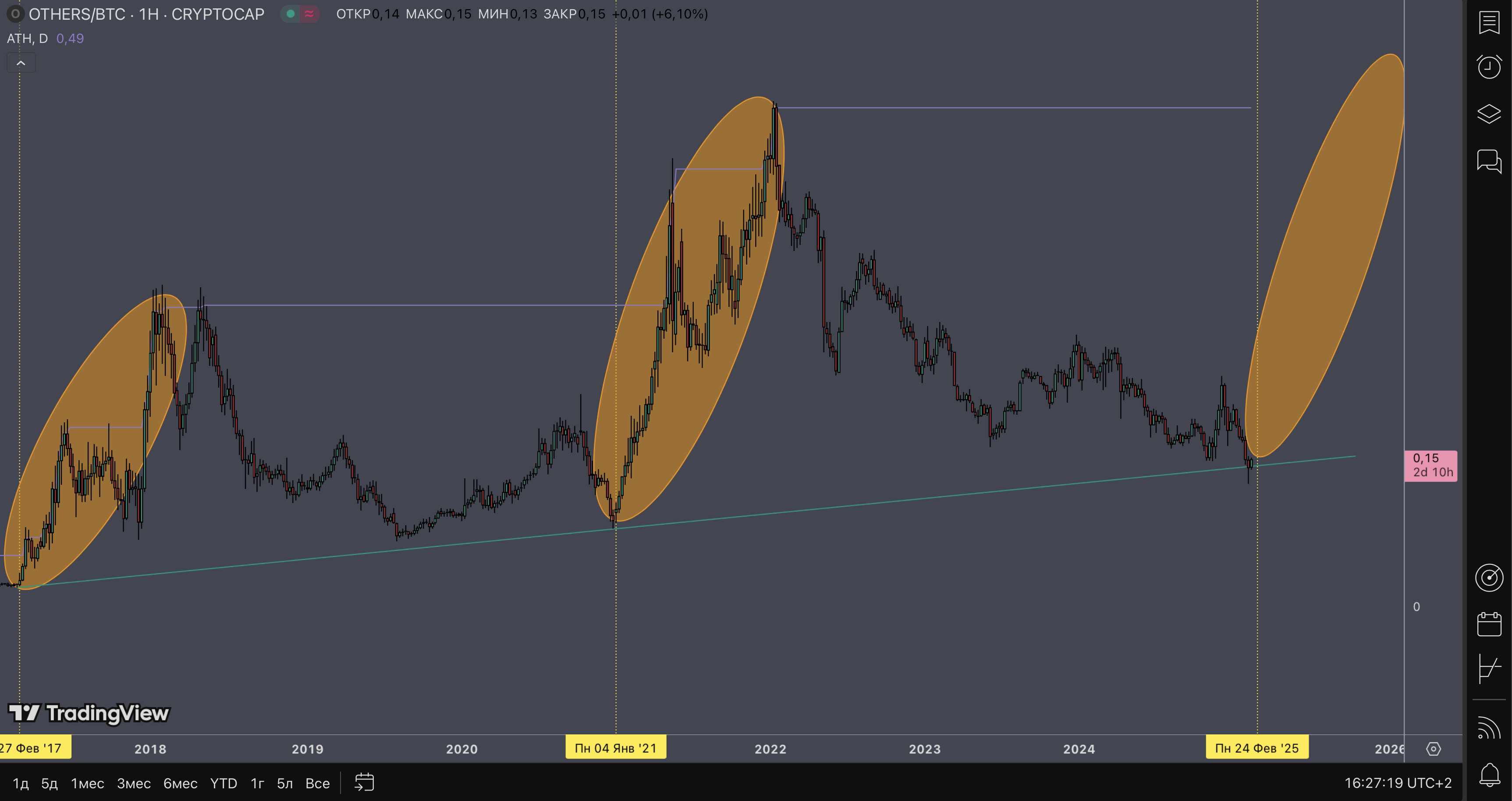 >В позапрошлый цикл стабильный обвал доминации начался в конце февраля-начале марта, в прошлом цикле тоже, но, перед этим был дополнительный сильный дамп в январе, я ожидал, что пойдём по прошлому циклу и доминация начнёт падать в январе, но, выходит падение в январе на том цикле было исключением, а правилом является конец февраля-начало марта, как в обоих циклах до этого. Так что ждать осталось +- месяц, который очень быстро пролетит.