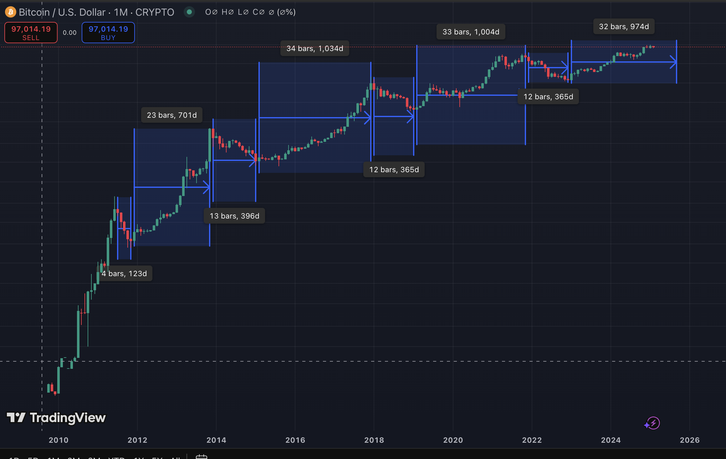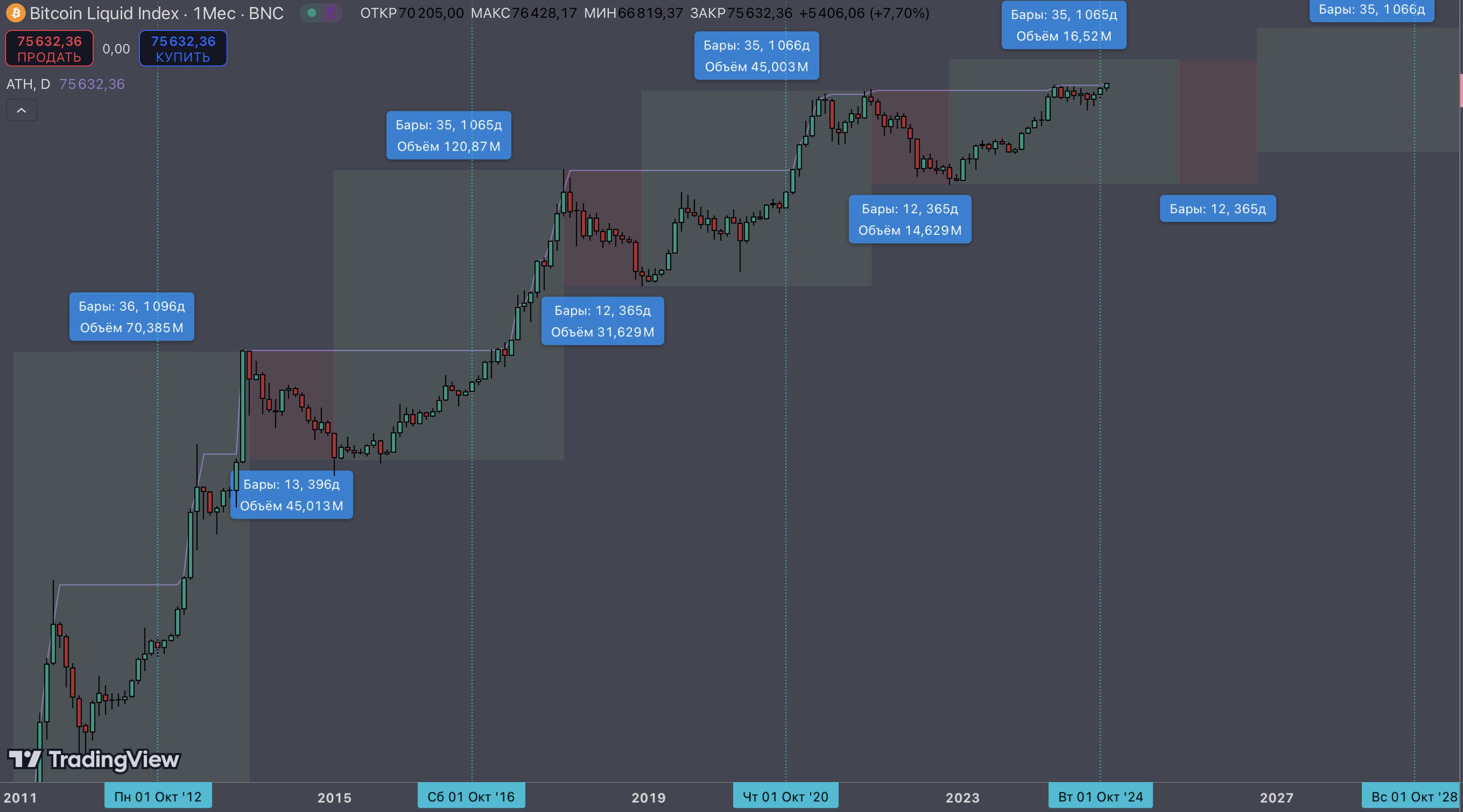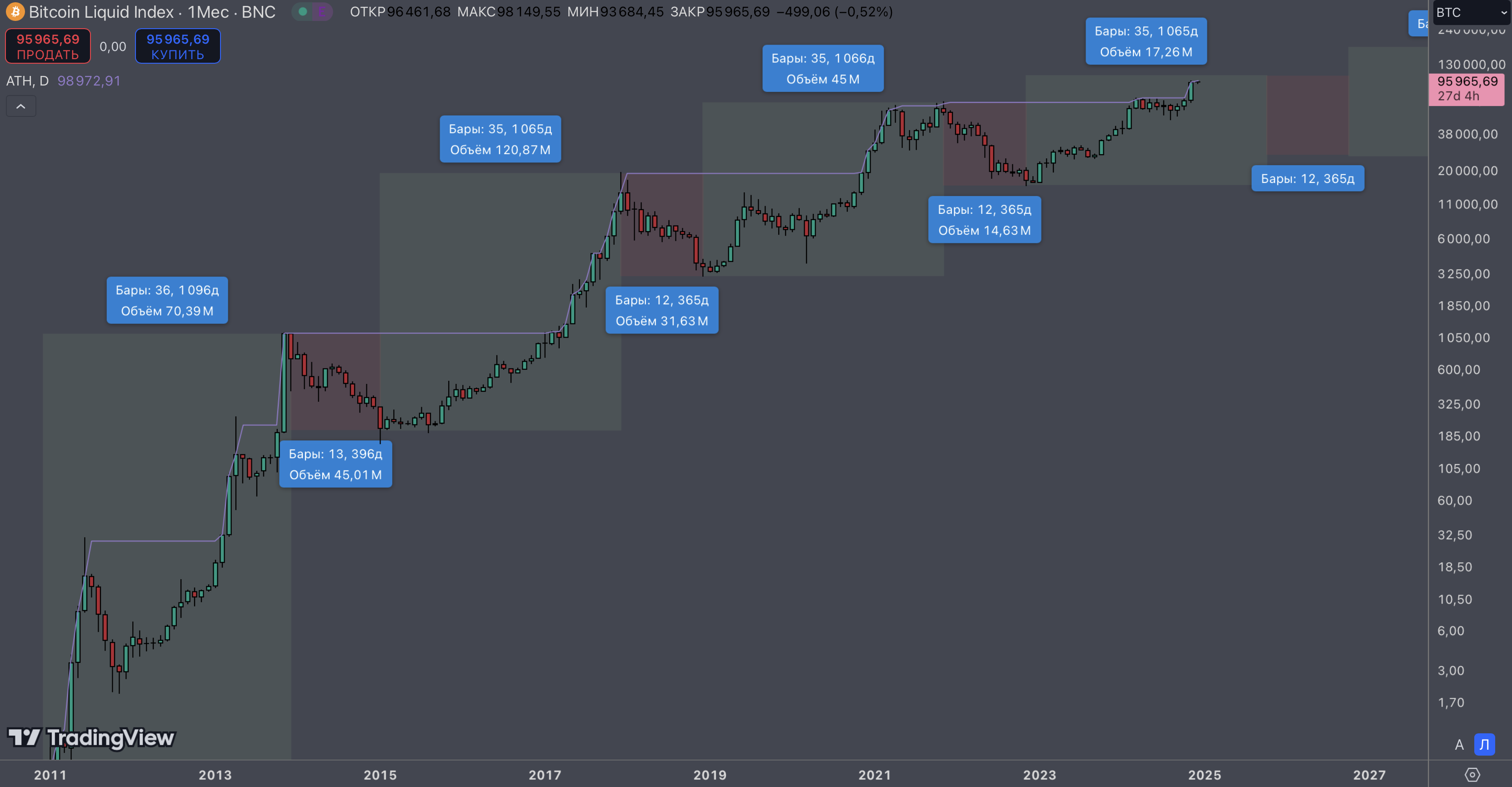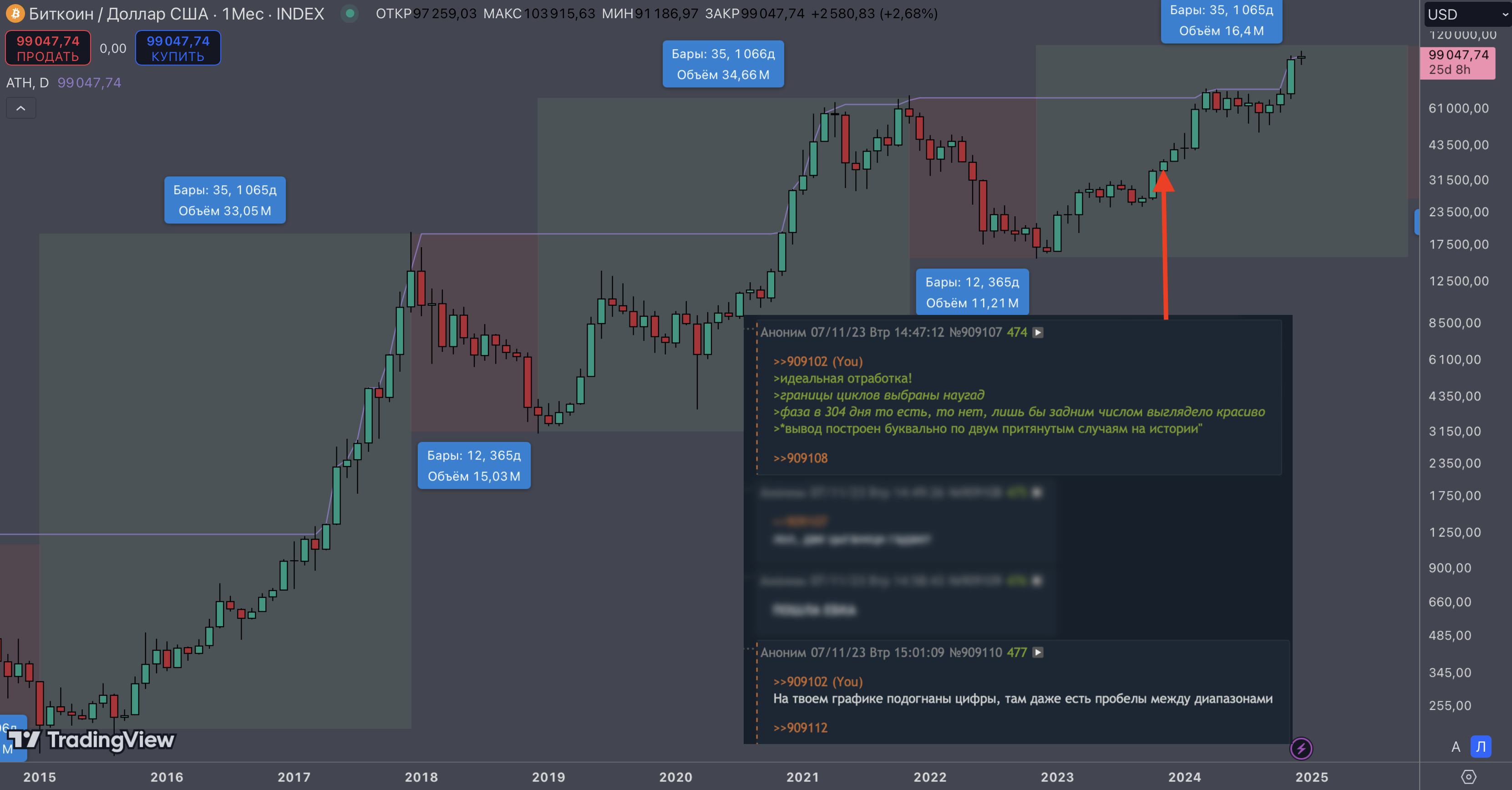 И еще вопросик: вот я нарисовал то же самое по трендам. Длительность каждого буллрана чет нихуя не стабильная - мы можем быть уже на пике. На чем основана цифра в 1065 дней выше?