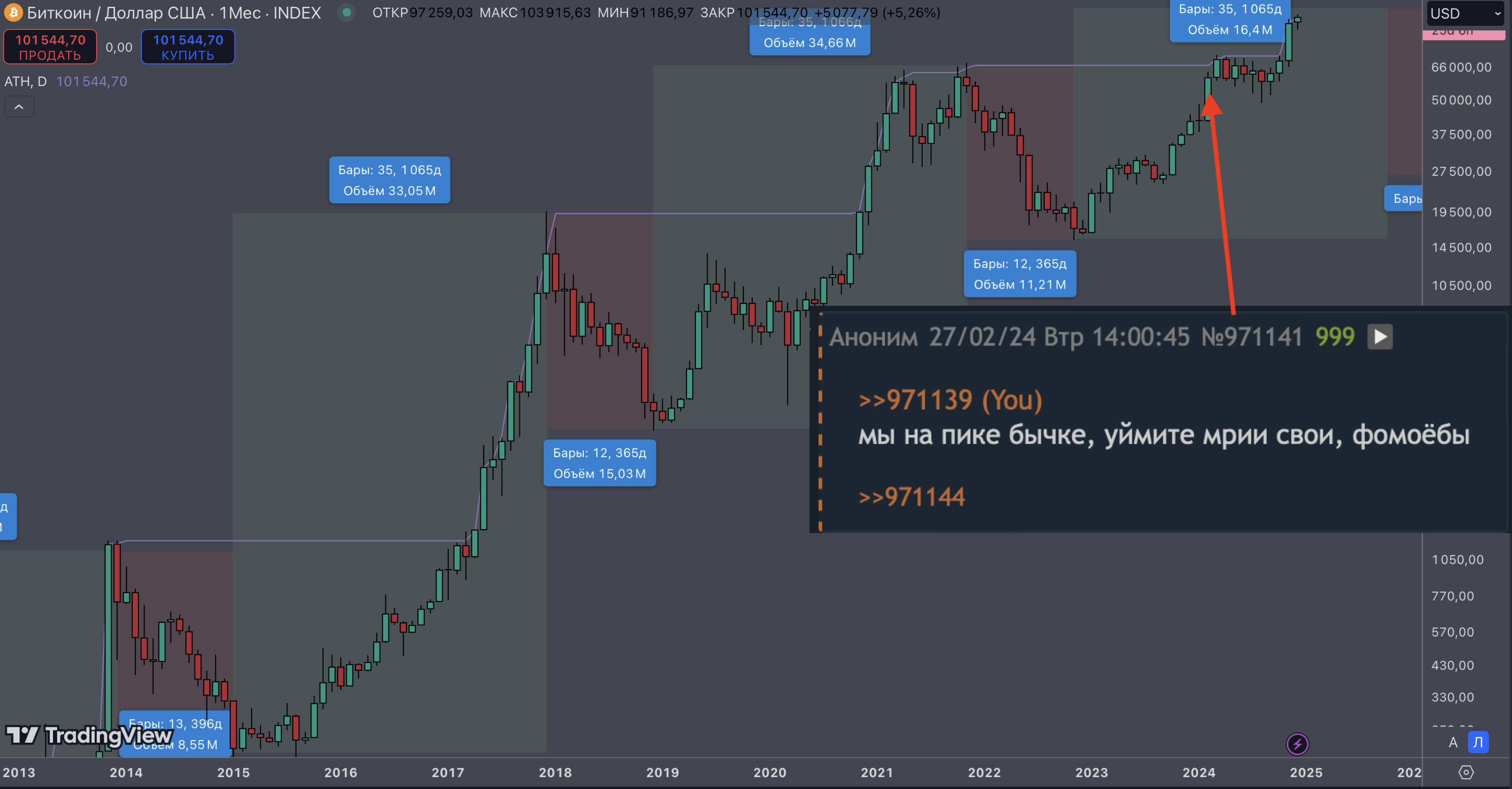 >>1231017 Маня, я изначально говорил, что отмерять циклы от халвингов это идиотия, когда есть идеальные 4-летние циклы хай-лой. Про какие-то новостные параши типа ЕТФ и трампыни говорят только лудики на минутках из закрепа. Я больше года назад говорил, что альтсезон по циклам весной 2025, просадка летом и второй пик осенью 2025, по этому фиксировать буду в апреле и ноябре. Сам выдумал какую-то хуйню – сам ей и перемагает.