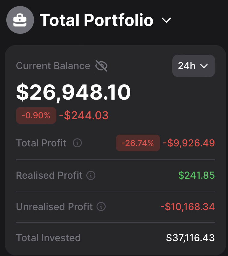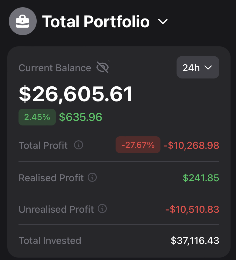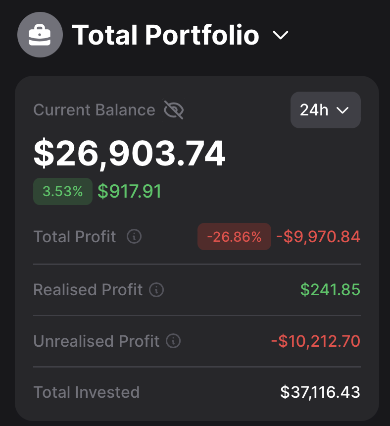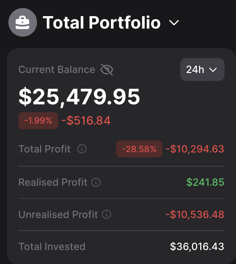 Здесь речь о реальном управлении балансом 4 года на споте, с минимальными рисками. На скриншоте: общий обьём криптопенсионного портфеля, количество монет, которые удалось накопить вкладывая по 200$ в месяц, текущий профит и средние точки входа по каждой позиции