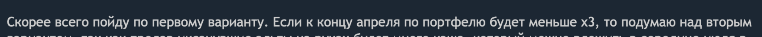 Забавно, что скрины в один и тот же день, но с разницей в месяц. Видно, как в январе был уверен железно, что фиксанешься на 2/3 котлеты. В феврале спесь уже упала, и появилось некоторое щекотливое если, но вариант фиксануть 3 икса не отброшен.