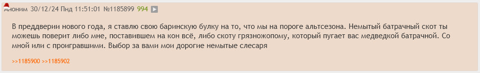 Шрек, конец апреля уже наступил, а где альтсезон? Неужели антилудоман обосрался? Или в течение 13 часов альта должна х6 дать, чтобы двачеров не разочаровать?