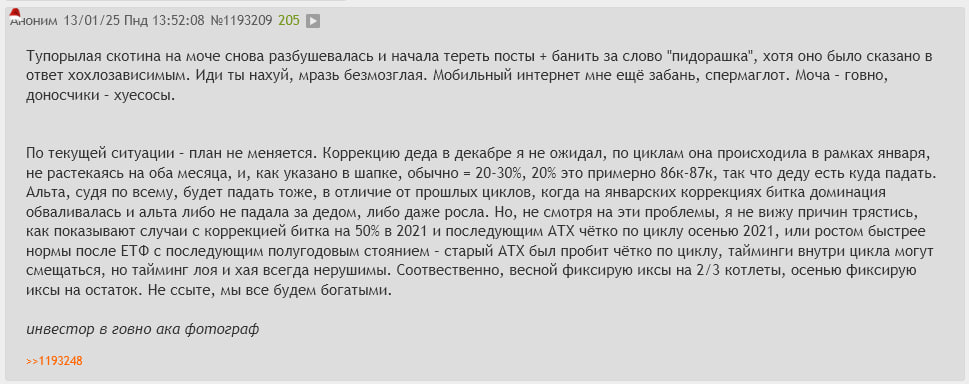 >>1256480 >Что он всегда говорил про 3-4 икса осенью Маня, открывай первые треды, я с самого начала писал про х3-х4 за цикл по результату двух фиксаций, в конце апреля и ноябре, в прошлом треде я тебя уже обоссал скрином из старого треда про размышления о трёх типах фиксации, хотя ты пиздел треду про один конкретный и что я уже решил. Снова ты себе выдумал манямирок и сам в него поверил.