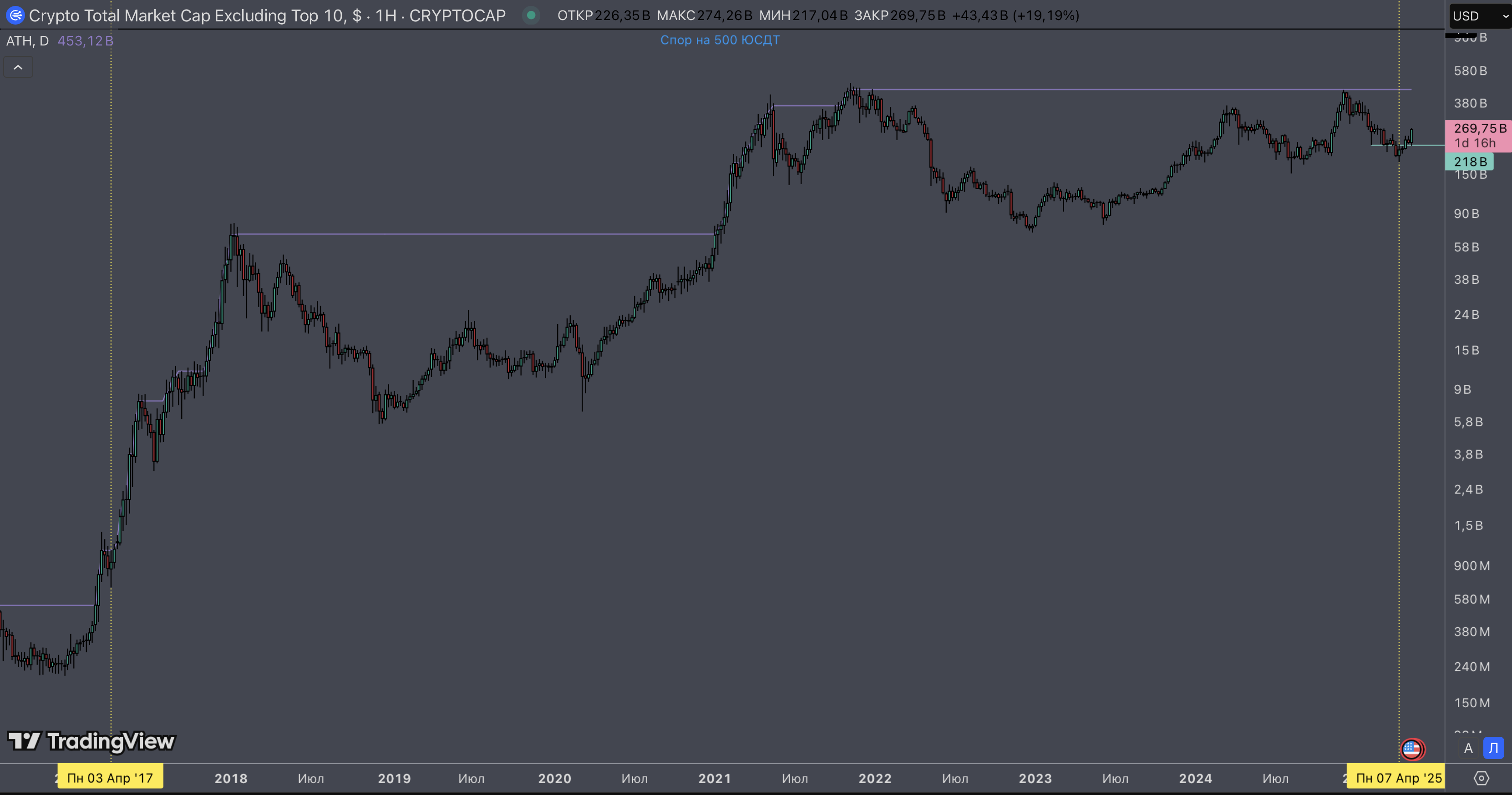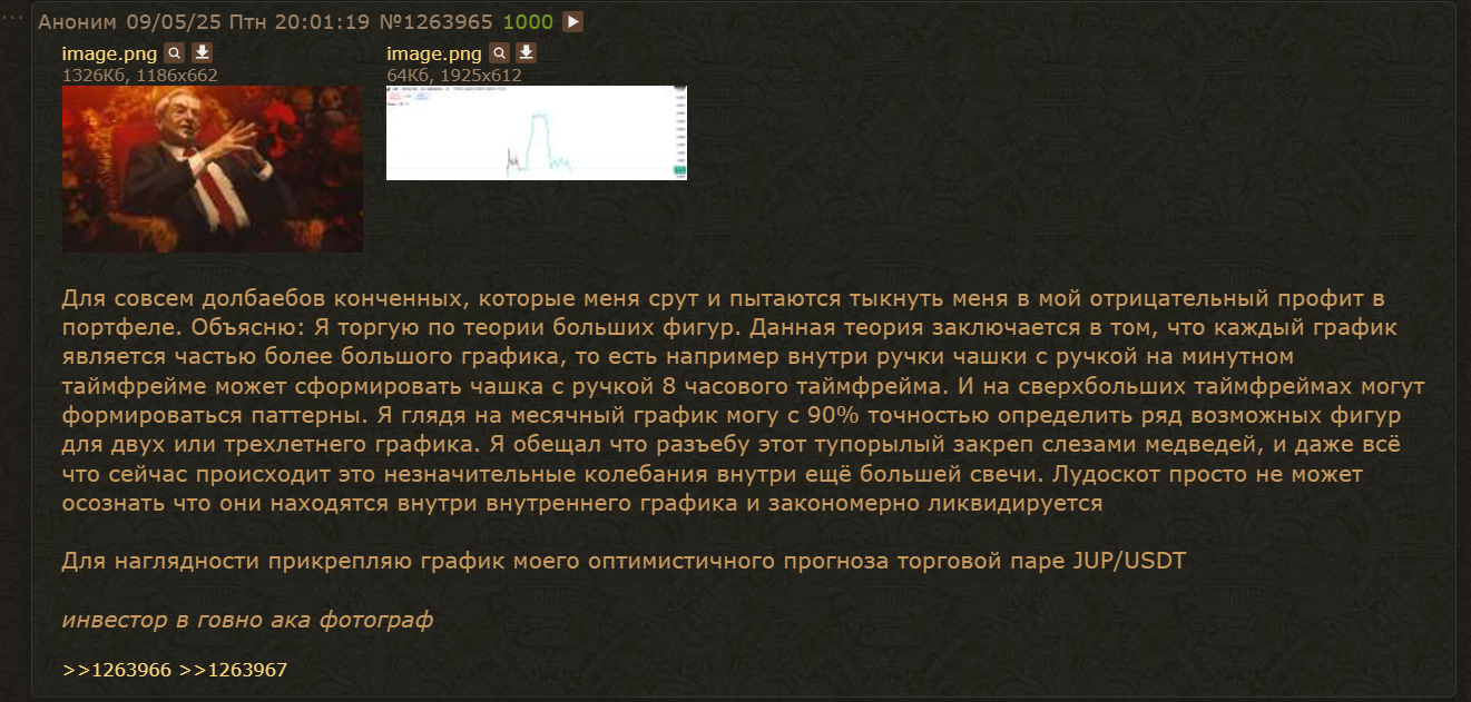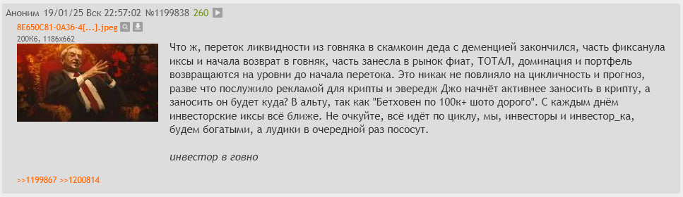 >>1257354 > вот эту хуйню с 1199 места? Почему не говно с 1301 или с 653? Мне надо было заглянуть в будущее и примерно почувствовать место в топе на момент 14 апреля 2025? Покупать я её начал 13 апреля 2023, ровно 2 года назад, она была на 350 месте, в октябре 2024 она была на 322 и давала х5 от моей средней, как видишь, купил я правильный актив в правильное время. > Почему не топ 50 смс? Если ты посмотришь старые треды, то увидишь, что в них, да и в закрепе много раз, я на вопрос "чё купить" всегда говорил СМС-100, край 200. Когда я начинал инвестировать ещё до открытия мной циклов, по стратегии докупа при снижении на фиксированный процент, то ориентировался на топ-400, спустя 3 года развития в этой теме я пришёл к тому, что на дне цикла надо покупать деда, за год до конца цикла переобуваться в альту, альту покупать желательно из топ-125, так как ТОТАЛы и OTHERS основываются на топ-125 и будет удобно следить за графиком, в крайнем случае можно брать топ-200, если что-то конкретное прям понравилось. Ограничиваться топ-50 не вижу смысла, что он, что топ-125 будут одинаково расти/скамиться с одинаковым шансом.
