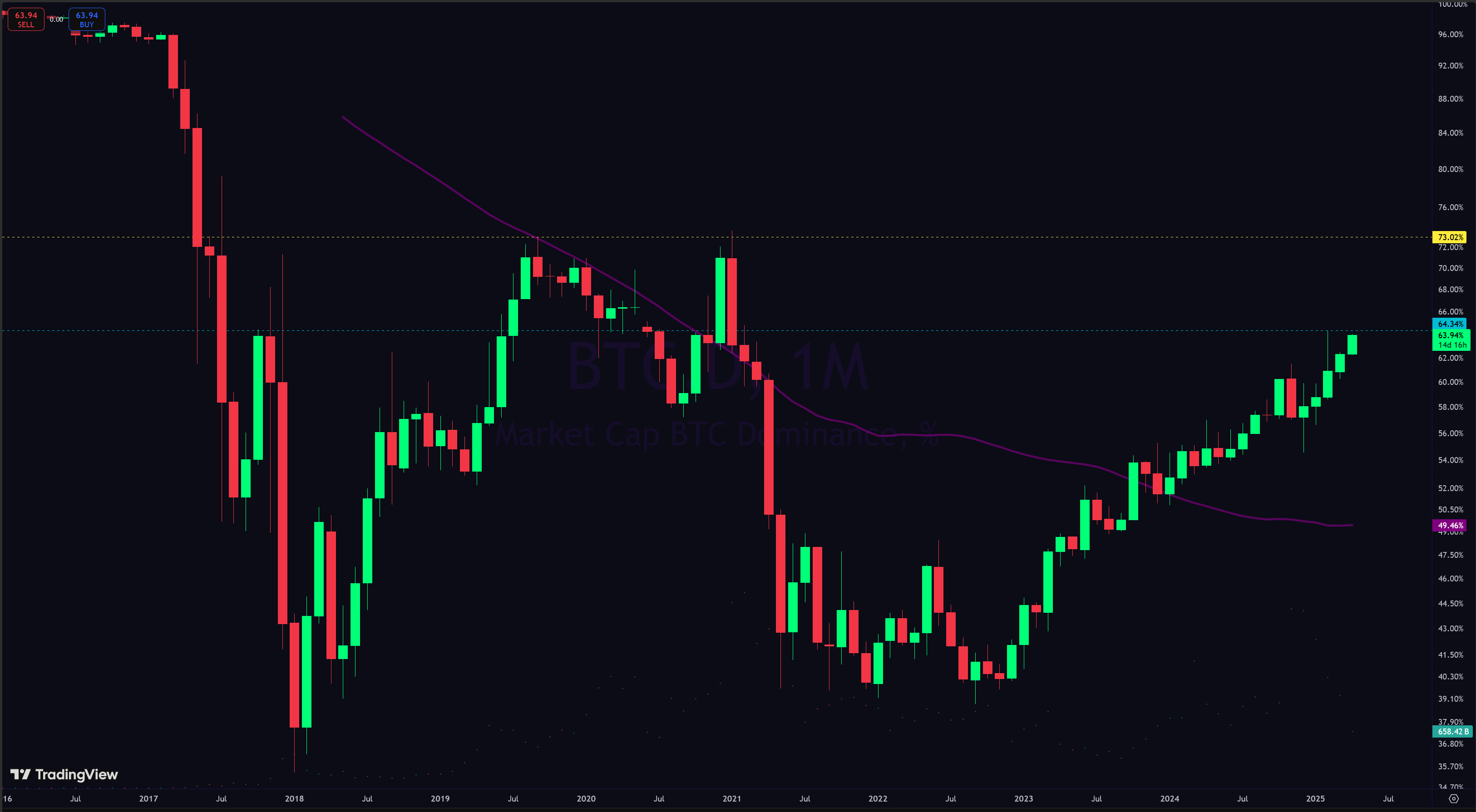 >>1265349 > Как думаешь, до какой доминации будет падение? В шапке: >По первому спору ожидается доминация деда ≤ 45% И капитализация OTHERS 1 трюлик. > И начался ли альтсезон? Смотря что ты под ним понимаешь. Для меня альтсезон это если OTHERS/TOTALы растут, а доминация падает + это всё происходит в последнем году цикла с ускорением роста весной. Сейчас весна последнего года цикла + индексы альты растут + доминация не обновляет хаи, соотвественно, я считаю, что альтсезон начался что по таймингу, что по доминации.