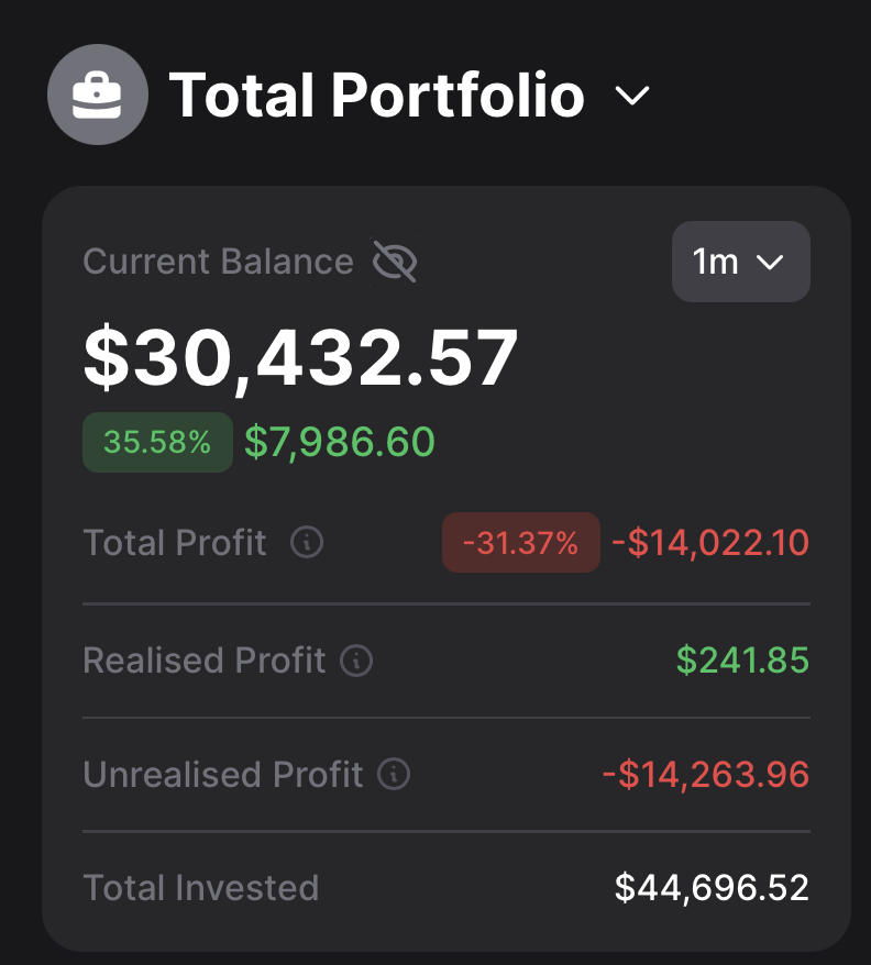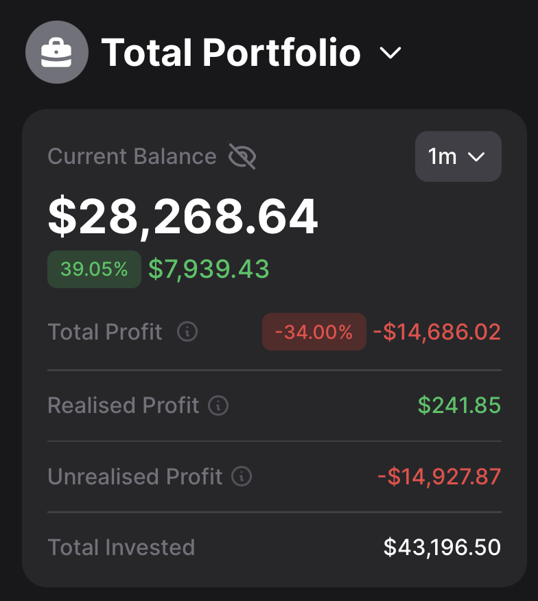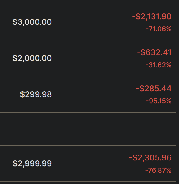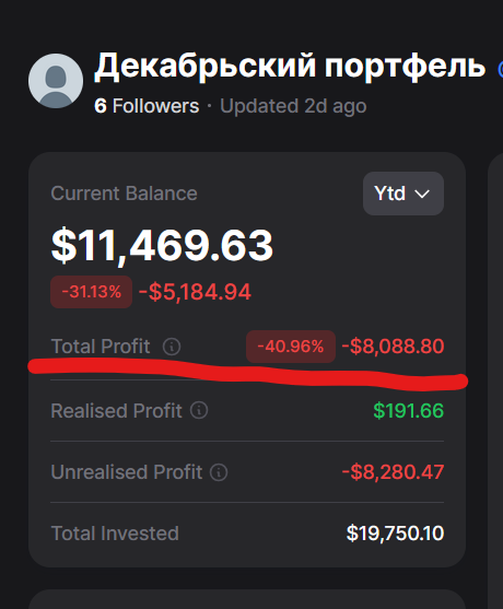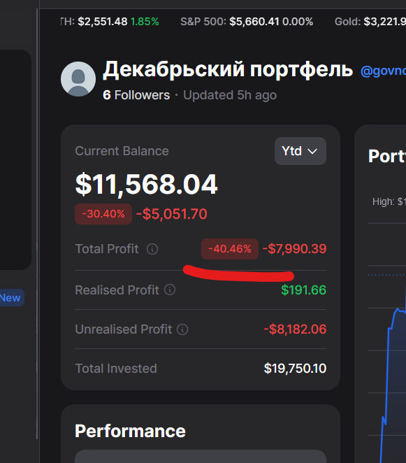 Я же говорил что Шрек выебет дегенератов, -50 это хуйня, все только начинается. Но я сам ебал в рот инвестиции, лучше трейдинг со стопами и стоп в безубыток. 44 процента за месяц. А если с декабря сидеть, то в ноль даже не выйти спустя месяцы. Но заебывает такой трейдинг весьма и весьма. Это прям работа 24/7.