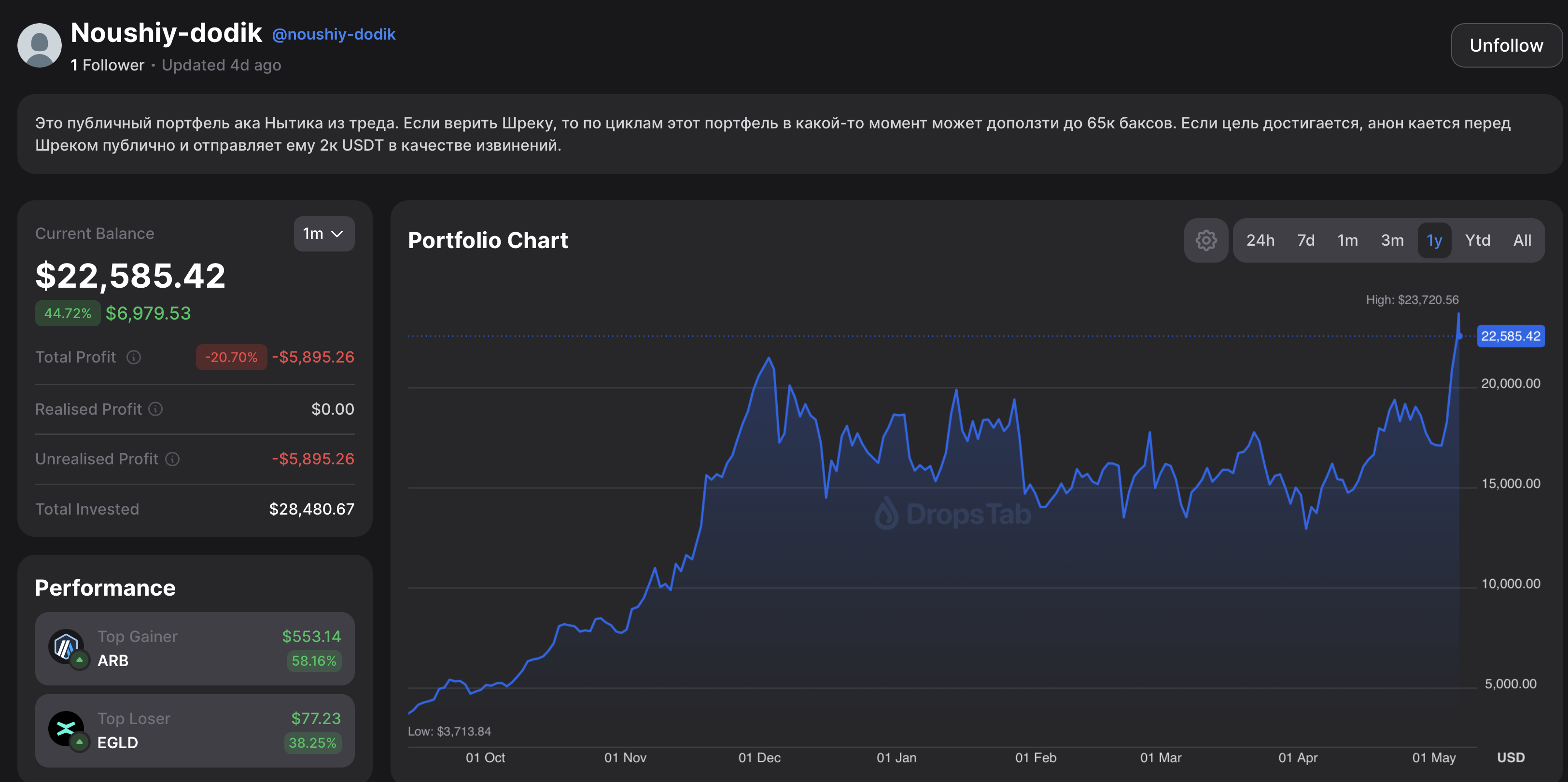 Появилось два спора на 500 ЮСДТ и 2к ЮСДТ. По первому спору ожидается доминация деда ≤ 45% И капитализация OTHERS 1 трюлик. По второму спору портфель Ссыкун-куна с 25.5к до конца цикла (ноябрь-декабрь 2025) должен достичь 65к, ссылка на его портфель ниже, фоловьтесь.