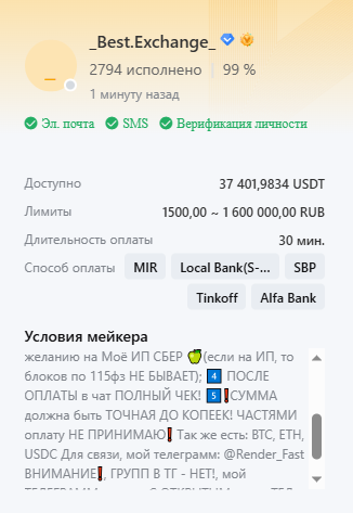 Сделки в основном от 3-лиц: белых треугольщиков и с карт доверенных лиц. Могут разбить платеж в 50к на 5-10 транзакций, поэтому уточняй заранее условия в чате. Сейчас Bybit банит аккаунты за 3-е лицо, процессинг, треугольники и разбитие платежей. На HTX белые треугольники разрешены, разбитие платежей не более 3-х. Есть риск банковских блокировок, 115-ФЗ и 161-ФЗ.