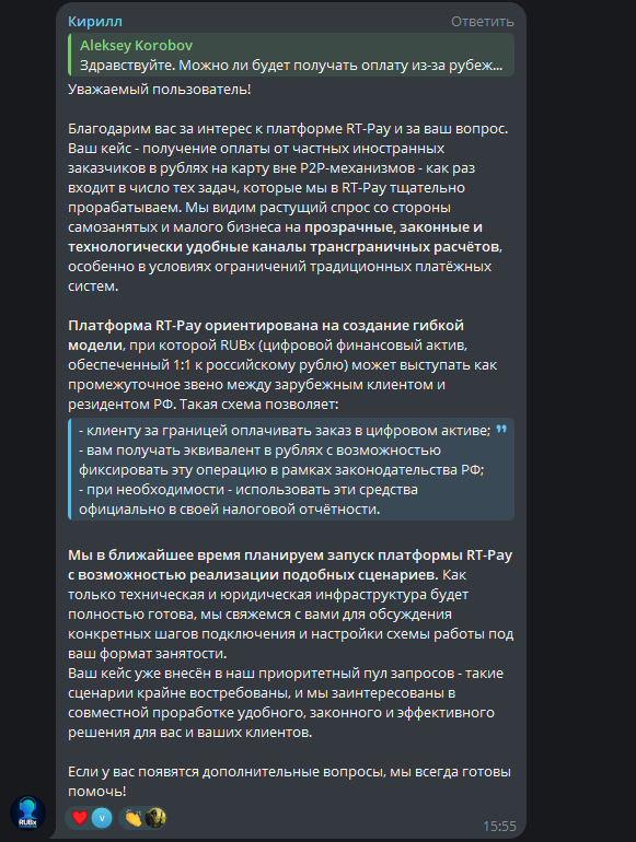 Bitbanker: https://bitbanker.org/ru/faq#deposit-withdraw.qr-top-up https://t.me/bitbanker_news Покупка крипты по QR-коду в белую через банк РФ. Комиссия за пополнение рублевого баланса — 1%, но не менее 100 ₽. Минимальная сумма пополнения — 10 000 рублей. Максимальная сумма пополнения — 2 999 000 ₽. Платеж обрабатывается в течение 2–8 часов и только в рабочие дни. Комиссия за покупку крипты <1%. Минимальный вывод с учетом комиссии 30 USDT, комиссия за вывод (в сети TON) - 2 USDT. Есть KYC и AML. Имеет лицензию VASP от киргизского регулятора. Пока нет функции продажи на банки РФ. Но есть другие способы, как вывод доллара через SWIFT/Visa либо наличный обмен или P2P. Можешь продать купленную крипту в RUB в будущем через описанные способы в шапке (РБ/P2C/Volet) - получение будет от юрлица.