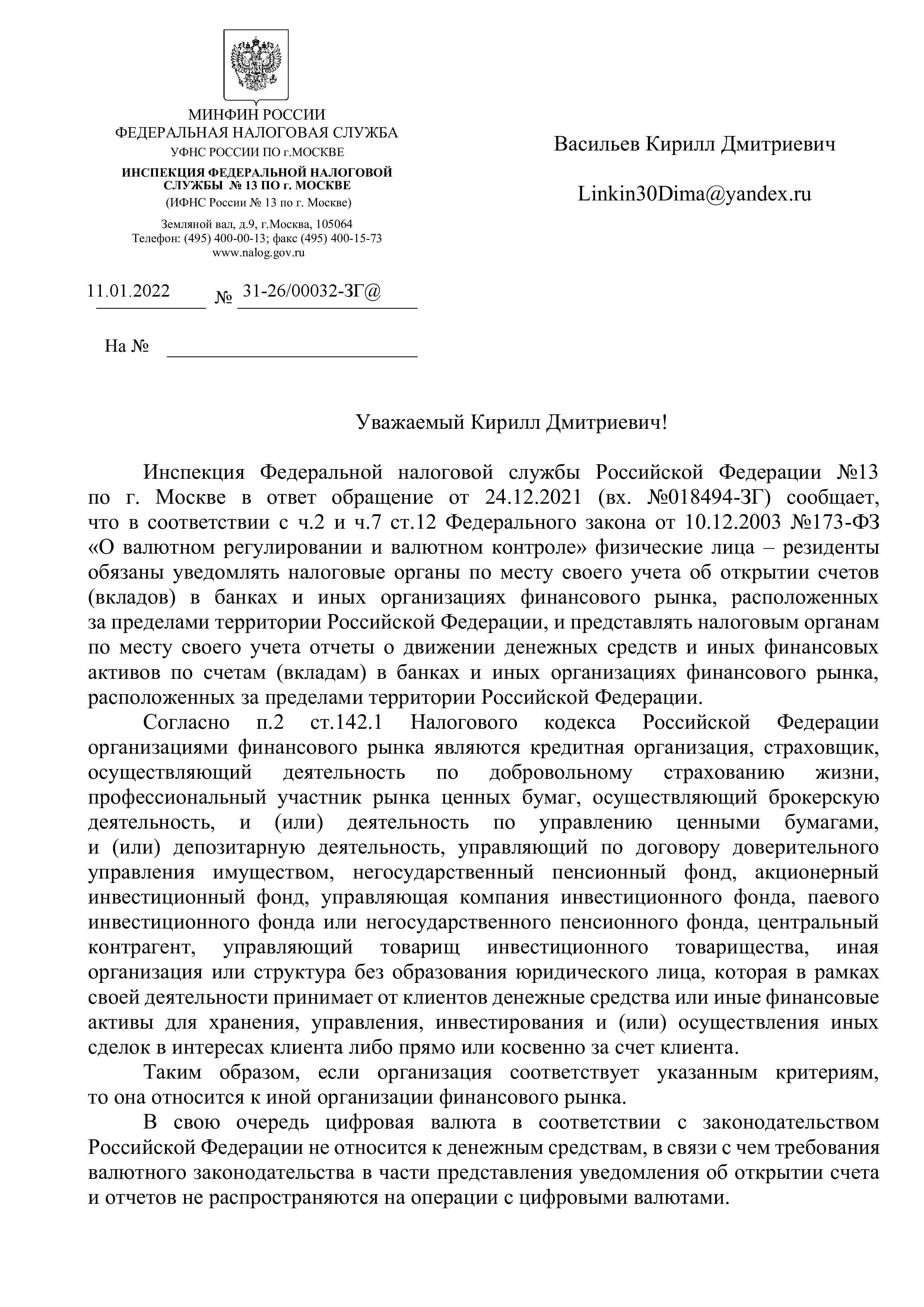 Ответ ФНС с пика не понятно на какой вопрос отвечает. Какой был вопрос? Судя из последнего параграфа там спрашивалось ТОЛЬКО про цифровую валюту.