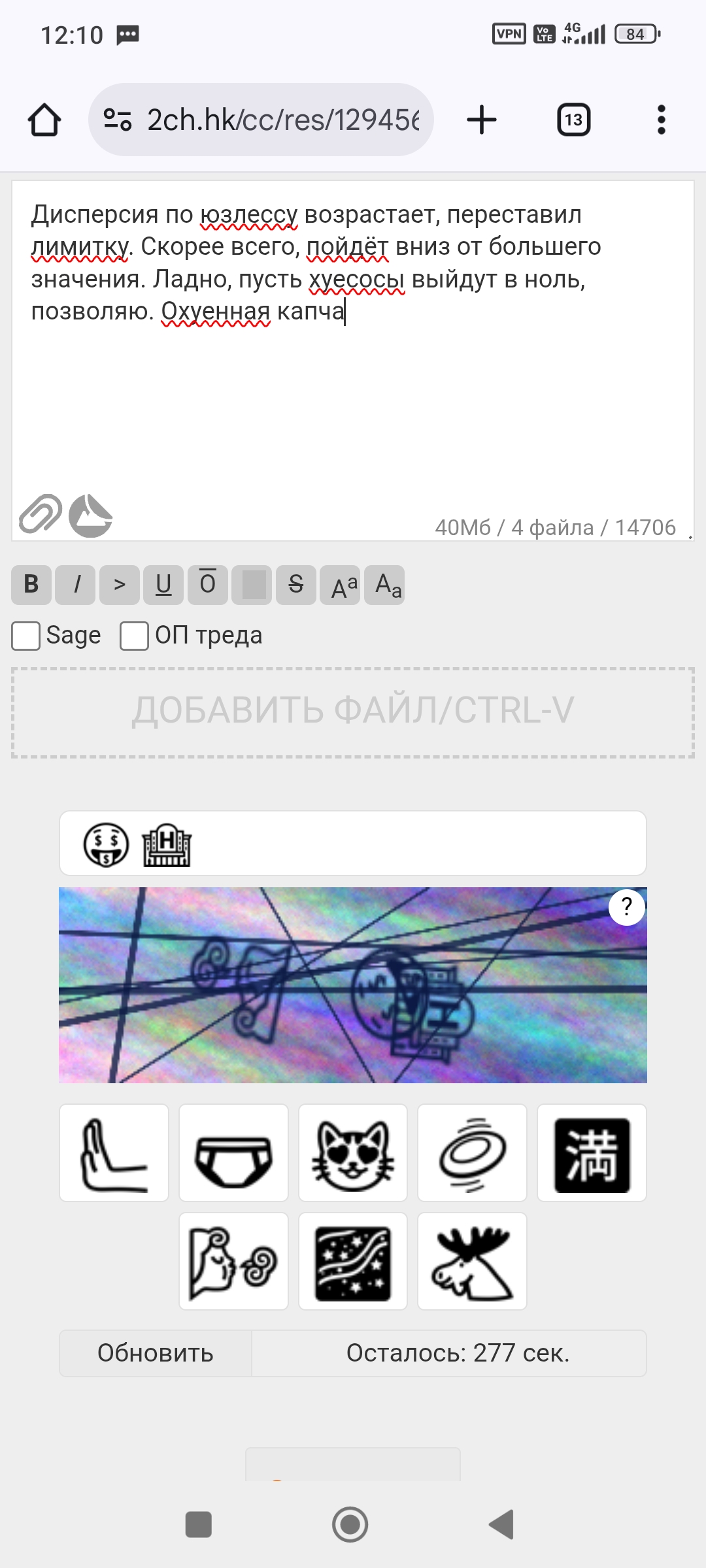 Дисперсия по юзлессу возрастает, переставил лимитку. Скорее всего, пойдëт вниз от большего значения. Ладно, пусть хуесосы выйдут в ноль, позволяю. Охуенная капча