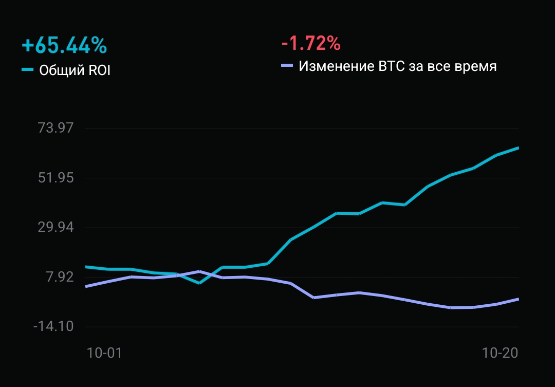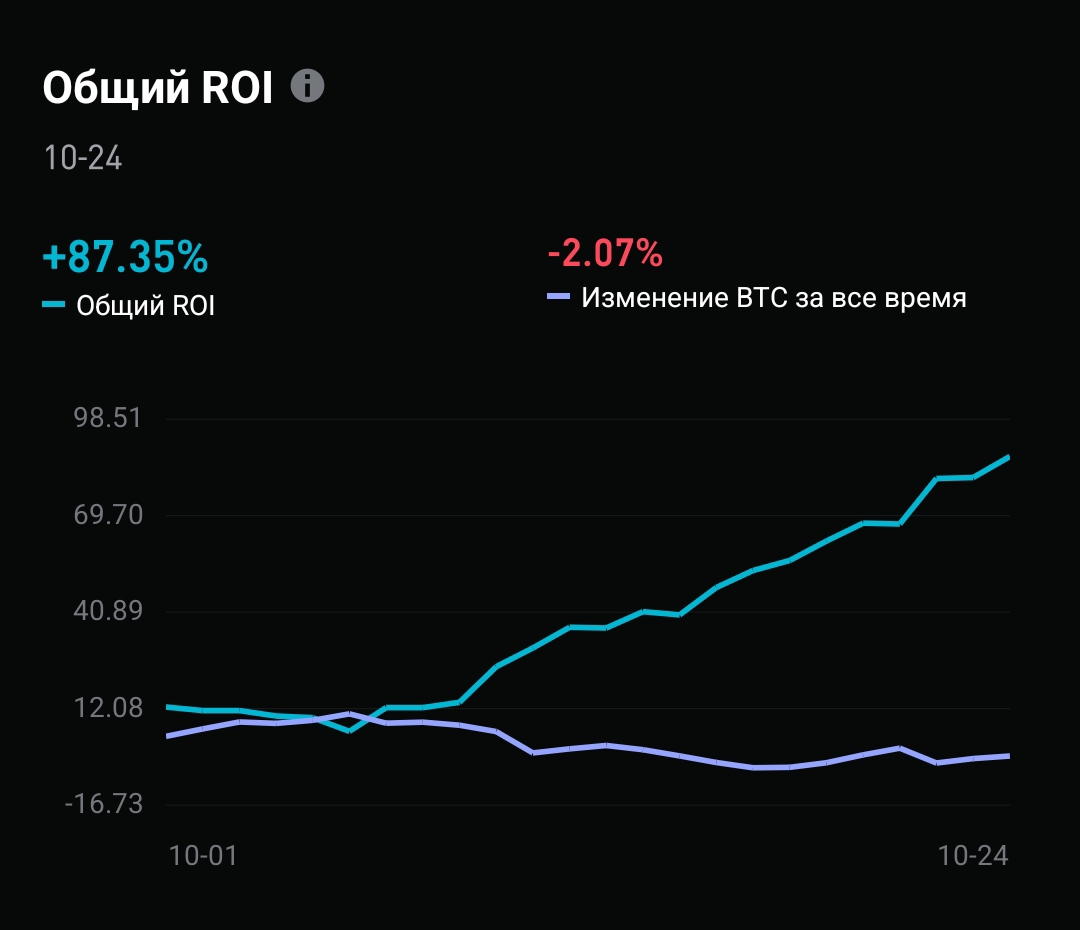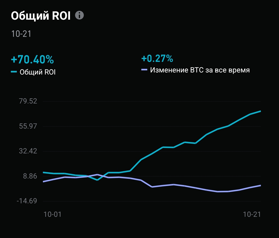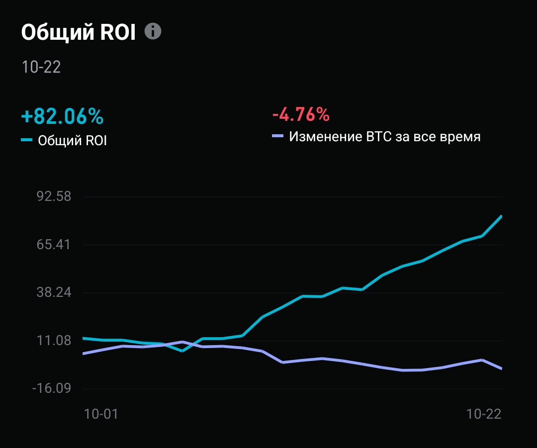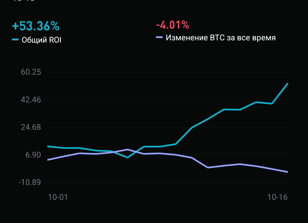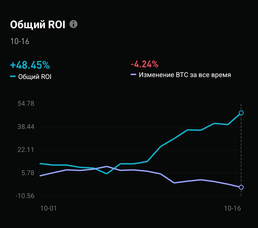 С начала челленджа, стартовавшего 1 октября, такой вот ROI. Меньше моих ожиданий, но пойдëт. Просадки ROI во многом вызваны, балансом реализованной и нереализованной прибыли, но разок я всё же въебал.
