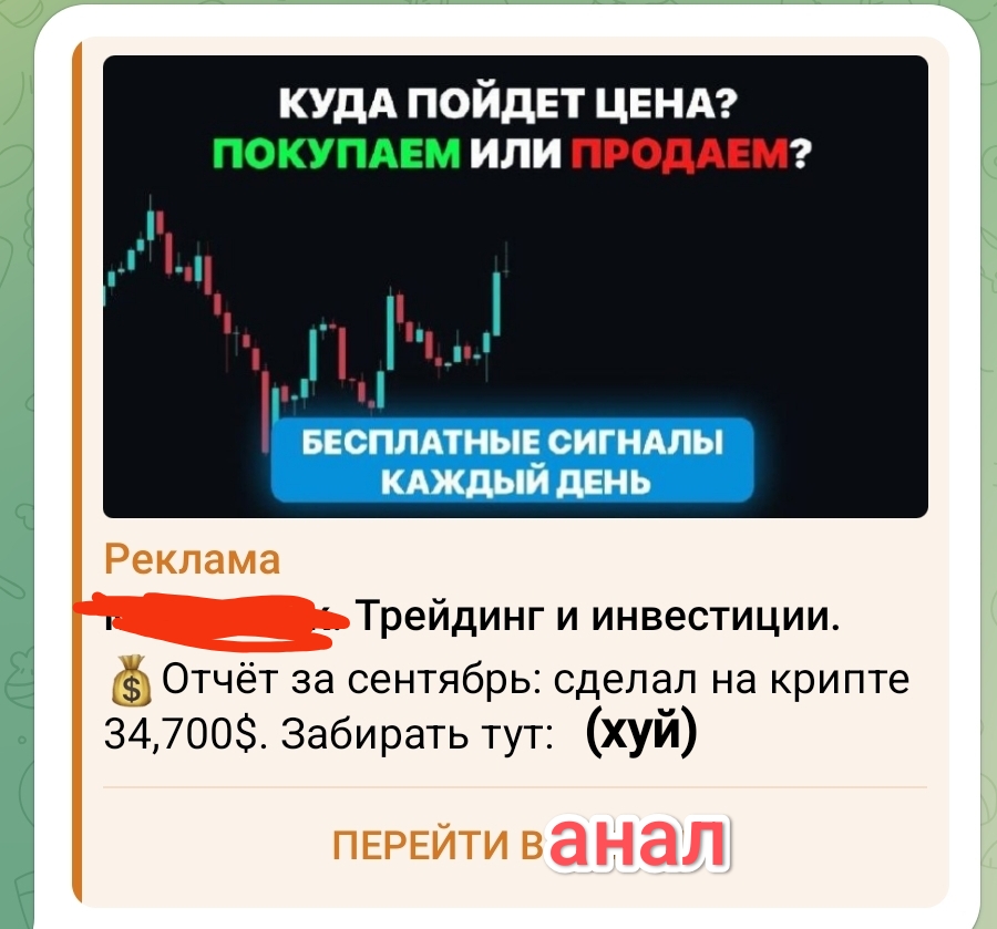 И важный момент! Абсолютно на всех курсах будет приблизительно так: - Заходите, у нас всё бесплатно! Через 5 секунд вы будете зарабатывать на любом рынке! Ты зайдешь, увидишь умного на вид дядьку, который будет пафосно пиздить, про то какой он охуенный, какой охуенный курс и давать инсайды по трейдингу. Он будет понтоваться, убеждать и дешку недоговаривать, а потом совершенно неожиданно предложит платный урок по смехотворной цене. Знай и помни: Это лузер-пиздабол! Он тебя ничему не научит, так как сам нихуя не умеет кроме пиздабольства (проверено легионом). И вот когда он предложит платный урок, тогда настанет твоё время! В этот момент, когда хомячья чепушня начнет проплачивать его курс, ты напишешь в общий чат следующее: Зачем успешному трейдеру мои копейки? Дальше ты увидишь кало-сальный подрыв, получишь массу лузлов и скорее всего тебя забанят.