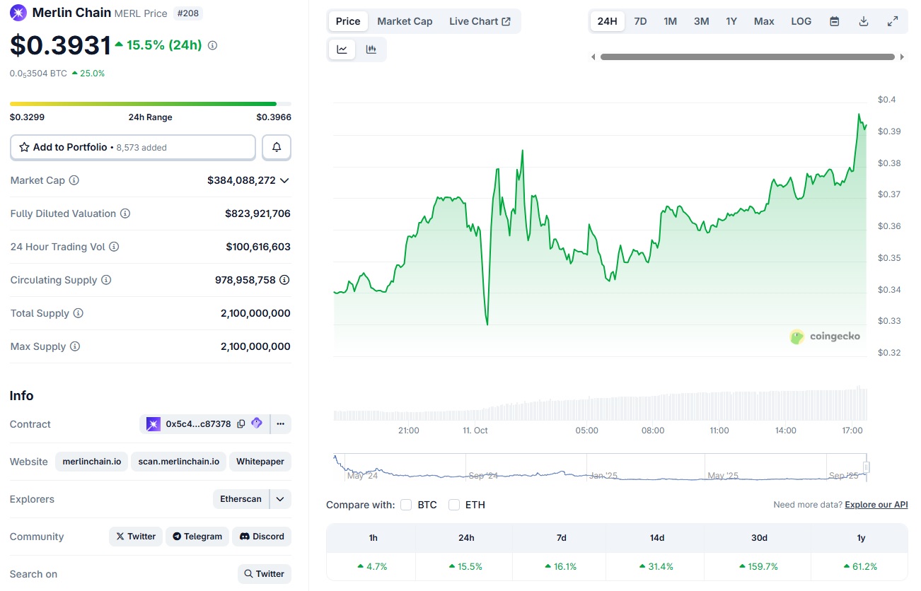 На данный момент это крупнейший Layer2 для биткоина. Наблюдаю за этой монетой уже больше года. Сейчас Merlin chain не раскручена в медиа блогерами и инфлюенсерами. Но если снова будет актуальным нарратив Bitcoin-DeFi, то можно увидеть значительный рост интереса к этой монете, как, например, было в конце 2023 года с Ordinals и токенами BRC-20.