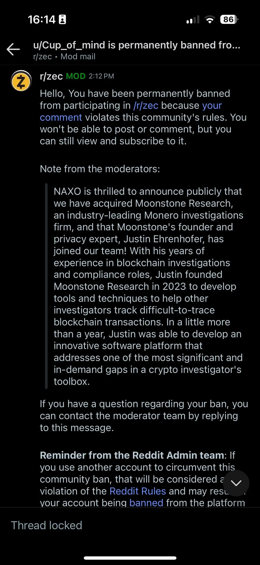 >>1316182 Нет. Это я забанил двух чуваков, которые начали засирать чат. Я понимаю, что ты пытаешься защищать Монеро, поэтому ведешься на троллинг, но тем самым, опять же, засираешь чат. Ты можешь создать новый аккаунт и вступить в конференцию, и я тебе дам админку, при условии, что ты будешь сразу банить тролля, а не вступать с ним в перепалку. А сама конференция публична, и в нее может вступить каждый.