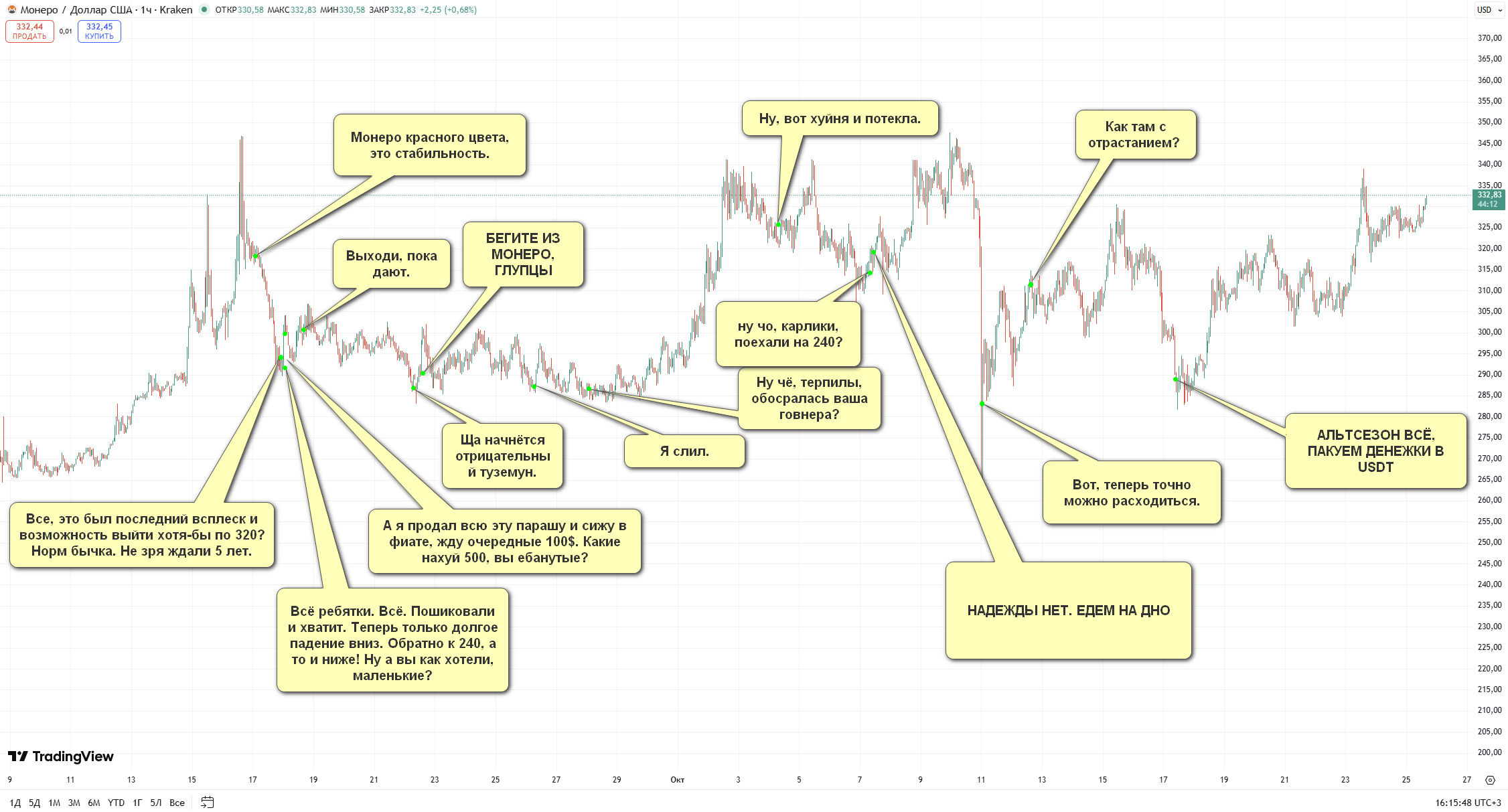 >>1327849 А всё стабильно хорошо. Все сделали профит. Даже самый йододефицитным, которые в прошлую бычку брали на замом заколе зелёной свечи, по 500 баксов, даже им дали возможность выйти в плюс. Разработка идёт стабильно. Монера работает. Просто кайфуем. А ты спрашиваешь тупые вопросы "бычка всё?". А мы ебём всё она или нет? Судя по растущей доминации usdt, перелома не предвиться. Но будущего никто не знает. Но я знаю одно. Монеро будет жить. И хуй кто что сделает, она БУДЕТ РАБОТАТЬ даже с курсом 0,00001$. И вот от этого вас и корёжит.