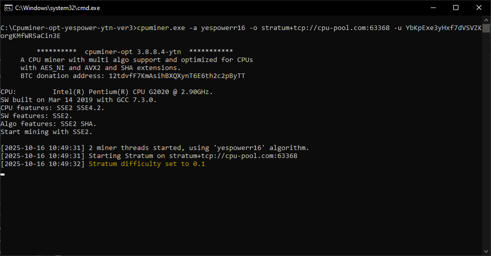 Также можно майнить и на http://cpu-pool.com/ Для этого создаем файл start.bat с таким содержимым cpuminer-sse2.exe -a yespowerr16 -o stratum+tcp://cpu-pool.com:63368 -u WALLET_ADDRESS.NAME и на http://yenten-pool.info Для этого создаем файл start.bat с таким содержимым cpuminer-sse2.exe -a yespowerr16 -o stratum+tcp://yenten-pool.info:63368 -u WALLET_ADDRESS.NAME где WALLET_ADDRESS это ваш кошелек, а NAME имя машины (полезно если у вас будет несколько). Если у вас одна машина, то точку и NAME пропускаем.