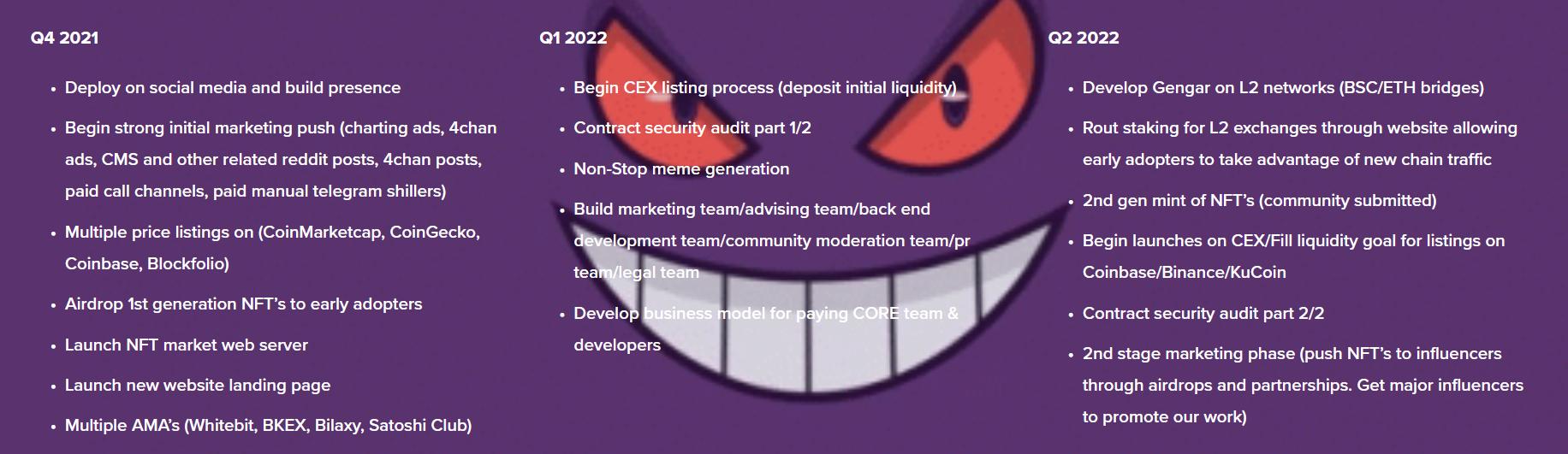 Gengar можете полистать сайт, https://www.gengarcoin.com/ роадмап прикладываю. был аудит от @inspectreftm: Contract looks good - simple, no minting of NFTs, but that could be in another SC. Verified Contract - no immediate issues (ie not a honeypot / not a rugpull) HOWEVER DYOR Small presale - less than 50% of the supply. 75% of presale will go to liquidity, with liquidity to be locked for 1 year. Please confirm before purchase. Website reads well - doesn't seem like a google translate job. Так что не тотал скам хотя бы. Сейчас идет пресейл https://dxsale.app/app/v3/defipresale?saleID=15&chain=Fantom я не знаю, почему он настолько плохо собирается, 115/1000 сейчас, но учитывая, что пообещали nft ранним участникам, то закину что-то, благо лимиты энивей небольшие.