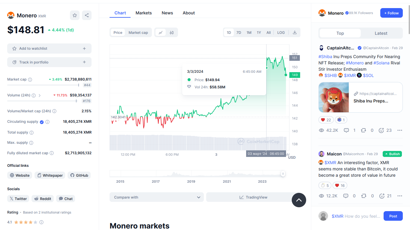 >>976027 >А вот тут поподробнее 1. Его курс не зависит исключительно от спекуляций лудоманов 2. Это наверное единственная тру криптовалюта с взаимозаменяемостью 3. Курс монеро по закону Макалфа это 1XMR = 58к не-денег